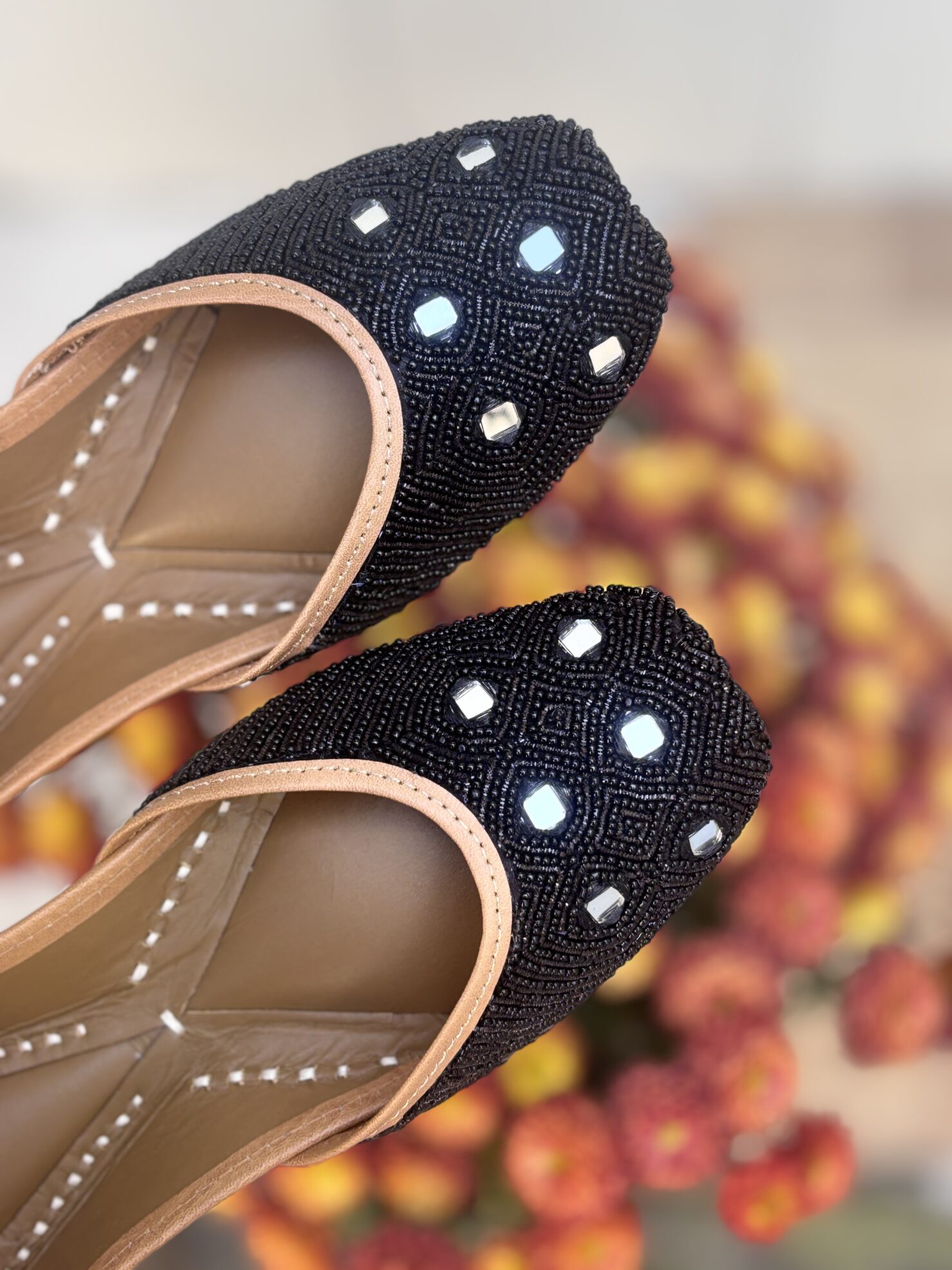Step into timeless beauty with our Dark Glint an All Black Jutti collection of handwork Juttis for women, with pearls, jerkin stone, black dabka embroidery on pure leather Punjabi Jutti, designed for women who appreciate delicate craftsmanship and effortless style.
