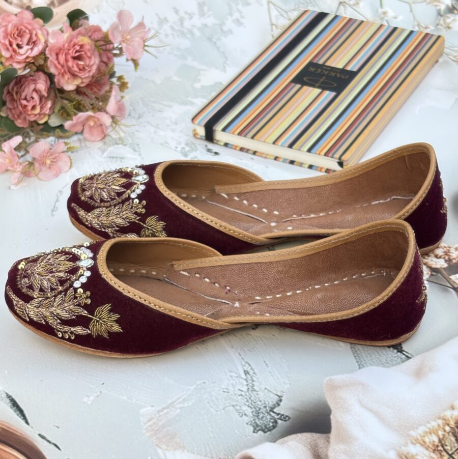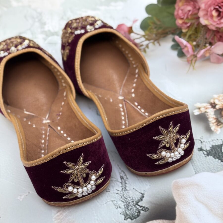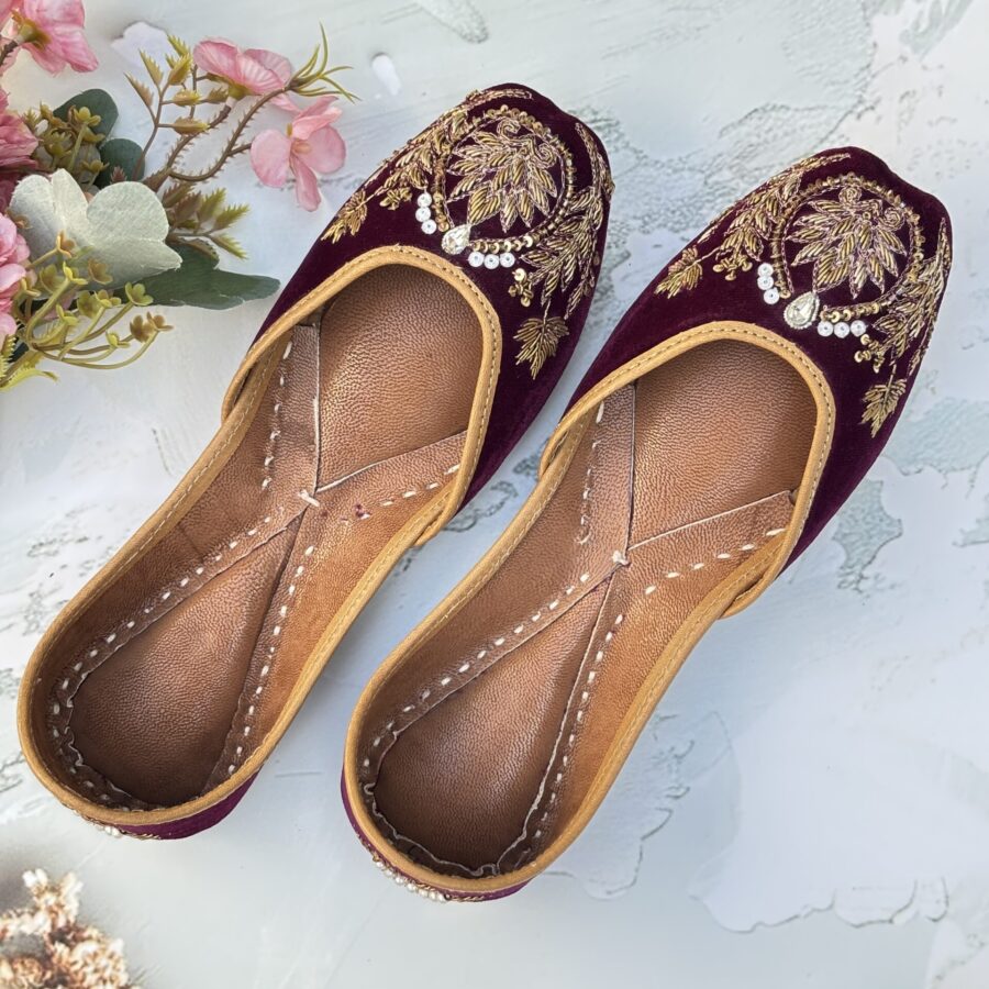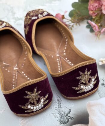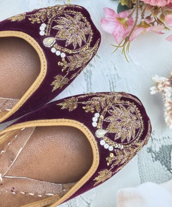 Elevate your footwear collection with these exquisite Wine Velvet Punjabi Juttis, where timeless tradition meets modern sophistication.