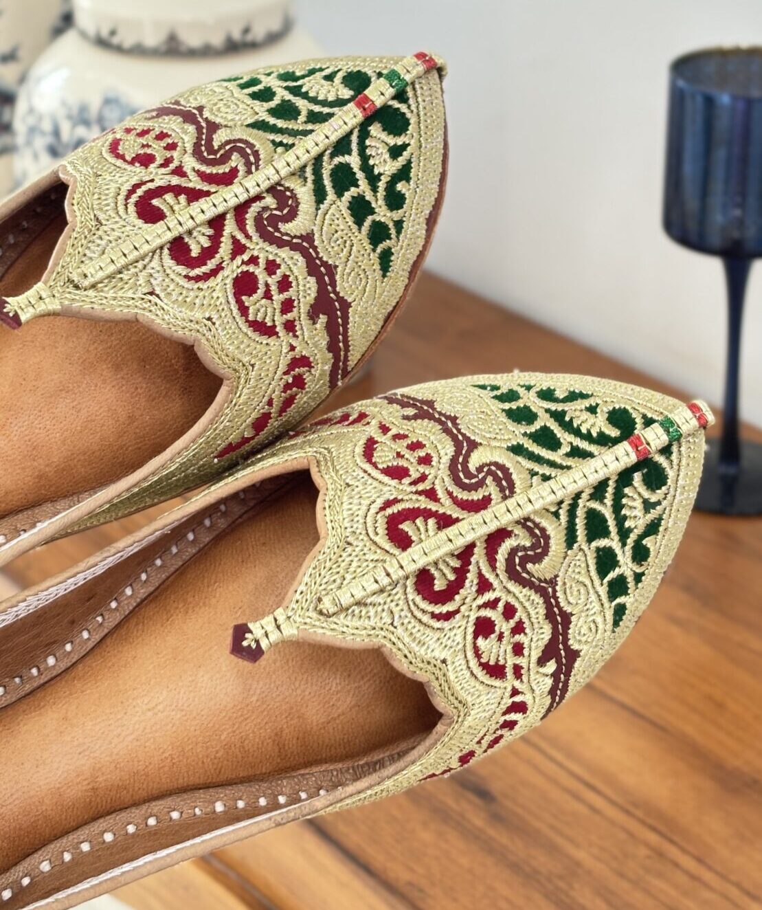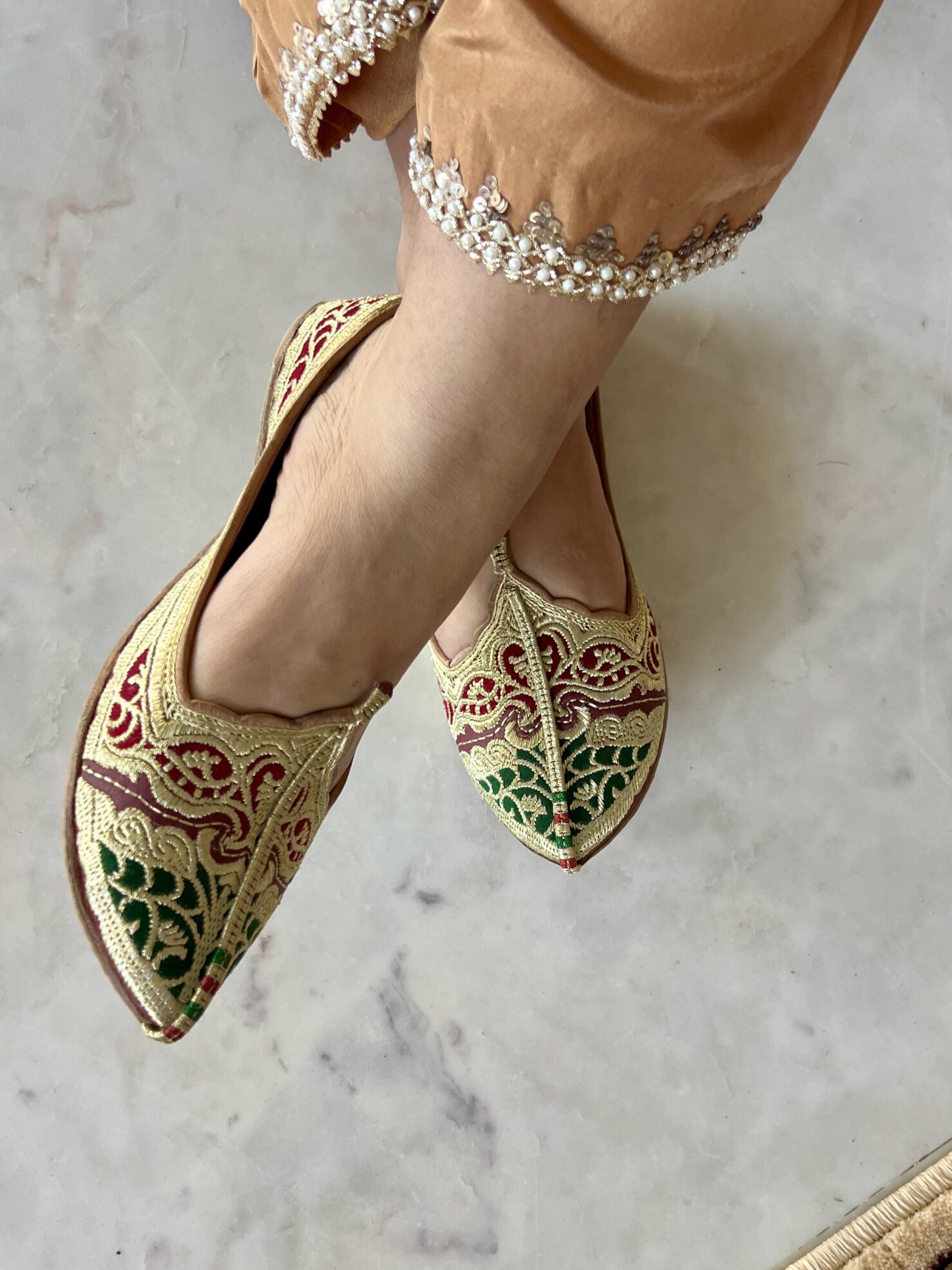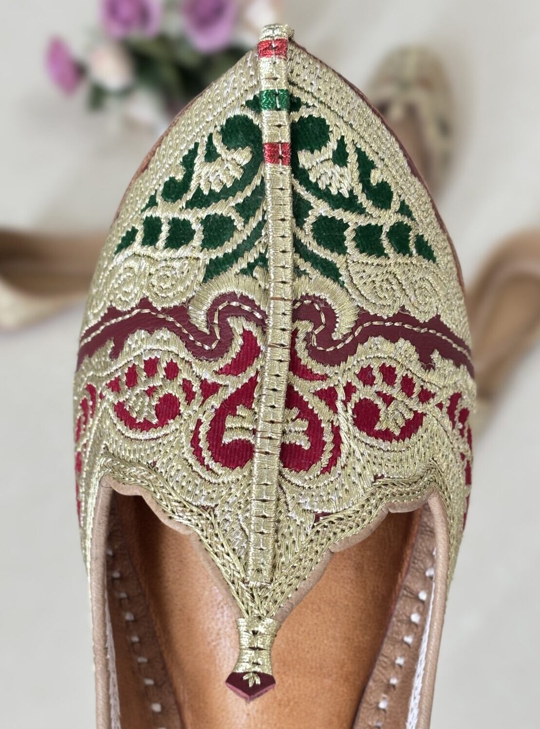 Elevate your ethnic style with our Golden Tilla Embroidered Biba Jutti(aka Dehli Fashion) with green and maroon velvet inserts, a stunning blend of tradition and comfort. Lovingly handcrafted by skilled artisans, this Punjabi jutti, also known as mojari or Delhi fashion jutti, is made from the finest single-piece, joint-less pure leather, ensuring unmatched durability and a flawless finish.