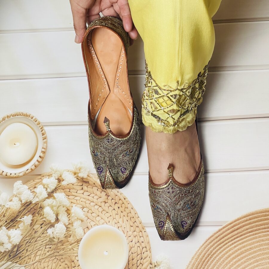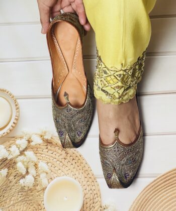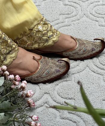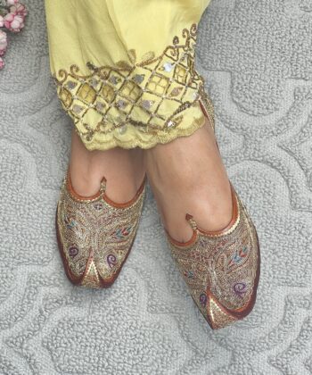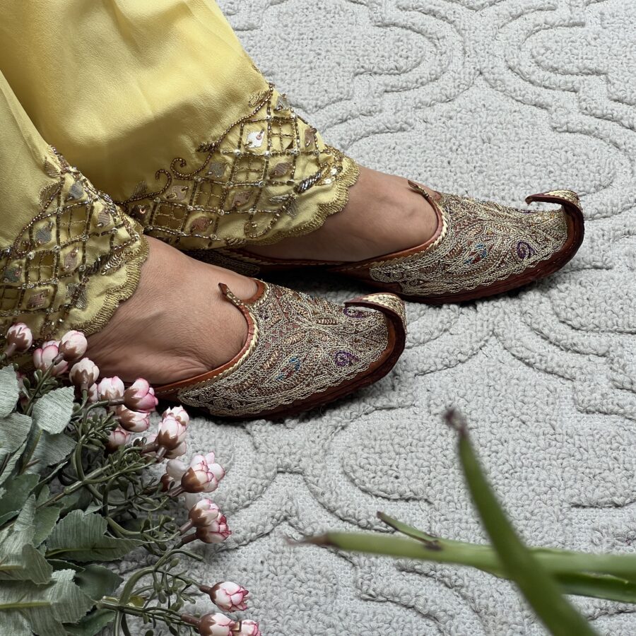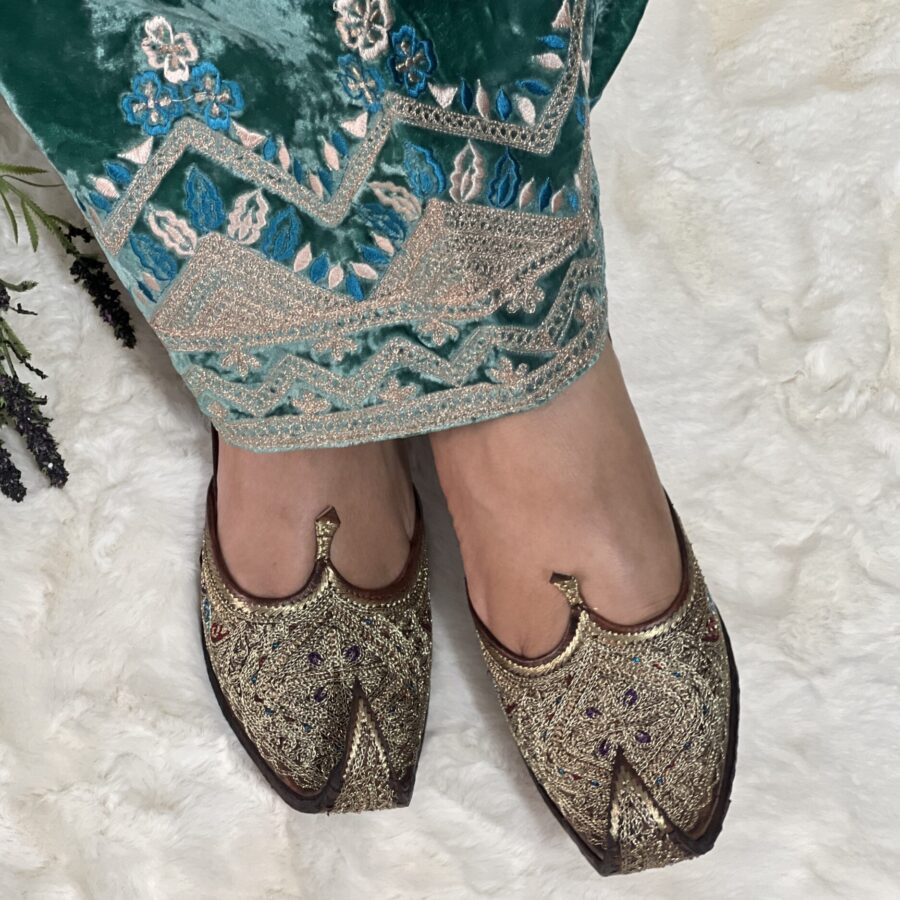 What makes it extraordinary is the intricate Pakistani golden tilla and Aari handwork by Afghan artisans, woven with heritage in every stitch. The rich texture and subtle sheen of this jutti make it the perfect match for bridal lehengas, shararas, or traditional suits.