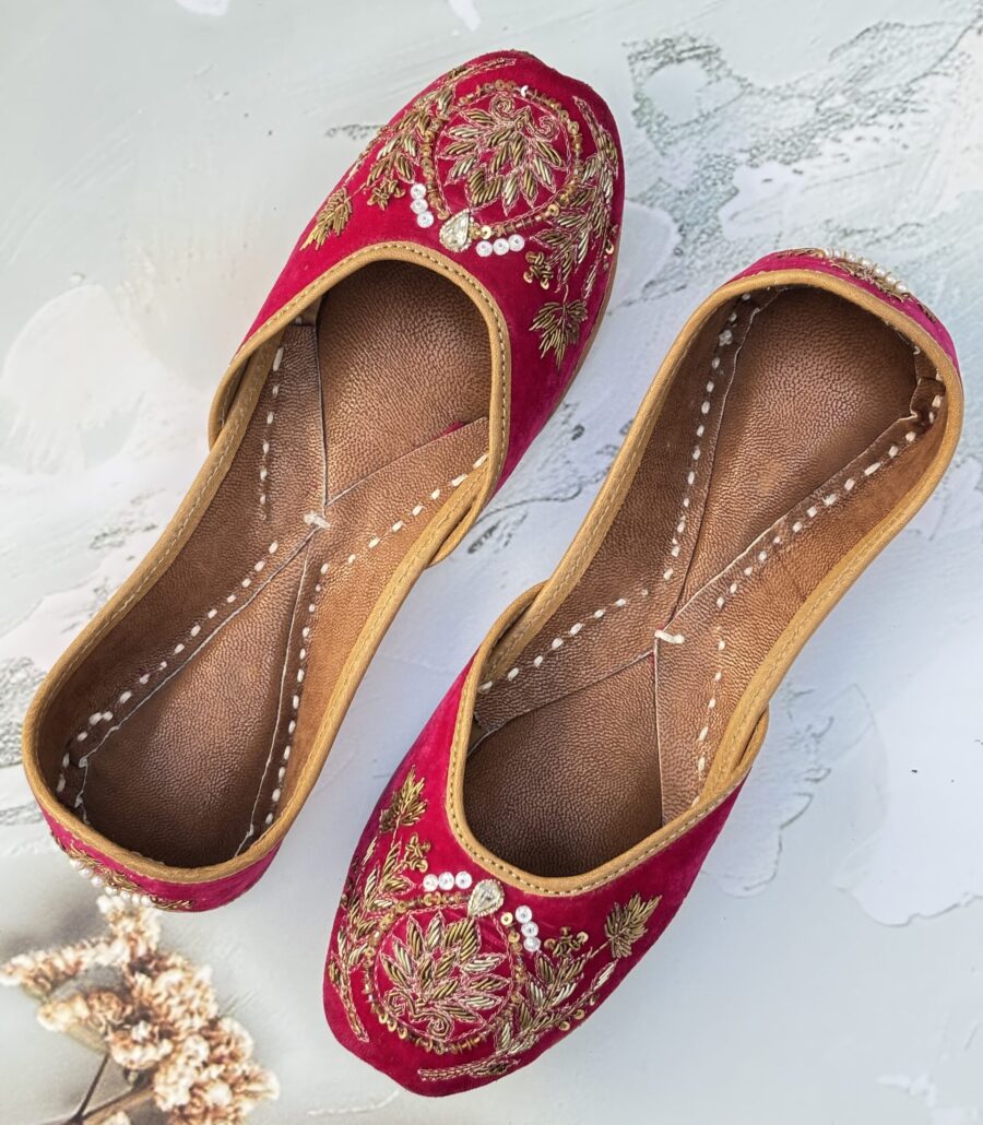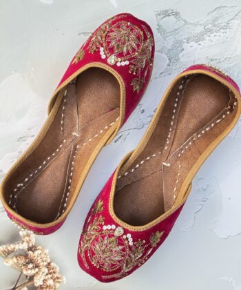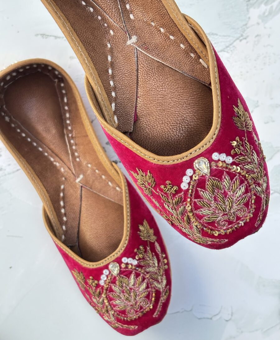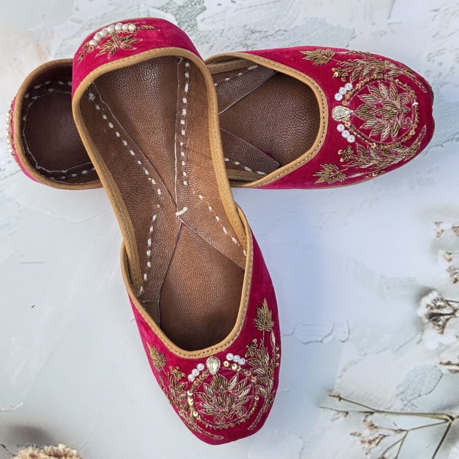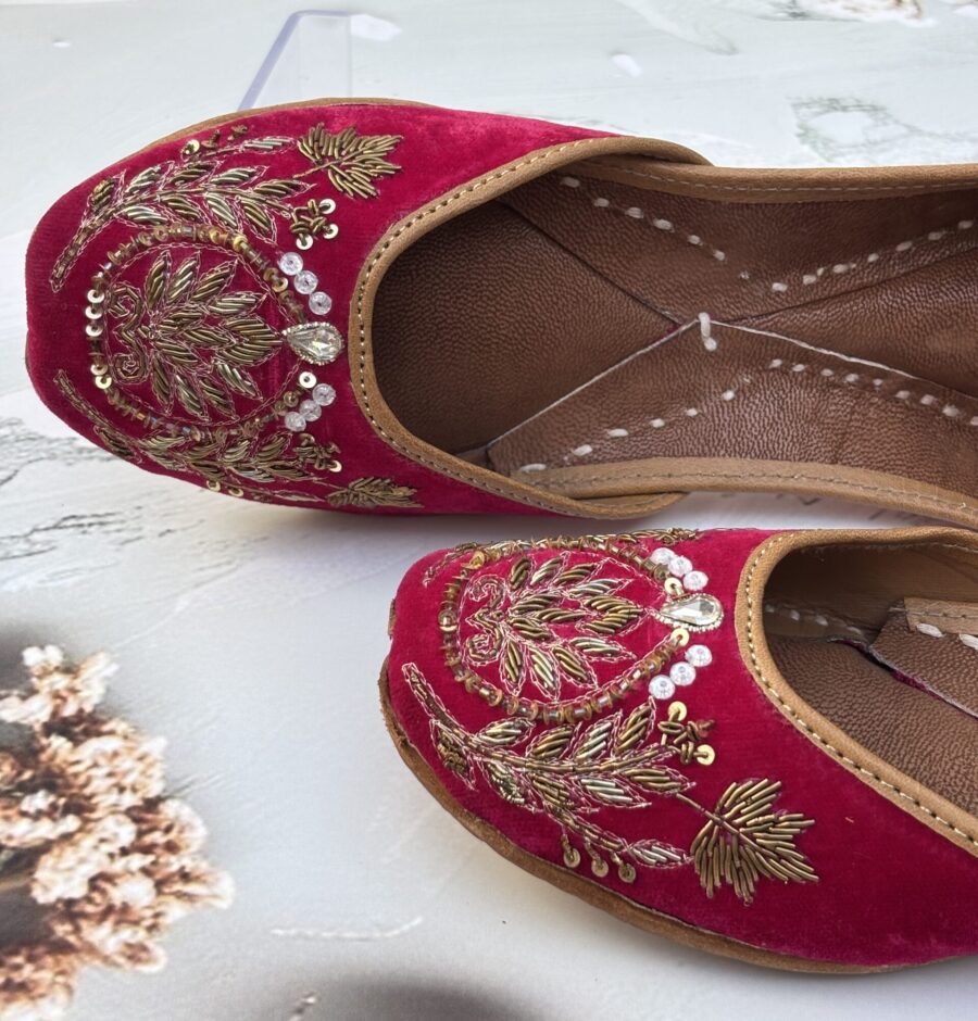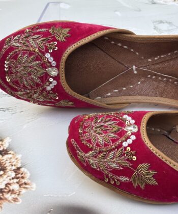 Elevate your footwear collection with these exquisite Rani Pink Velvet Punjabi Juttis, where timeless tradition meets modern sophistication.