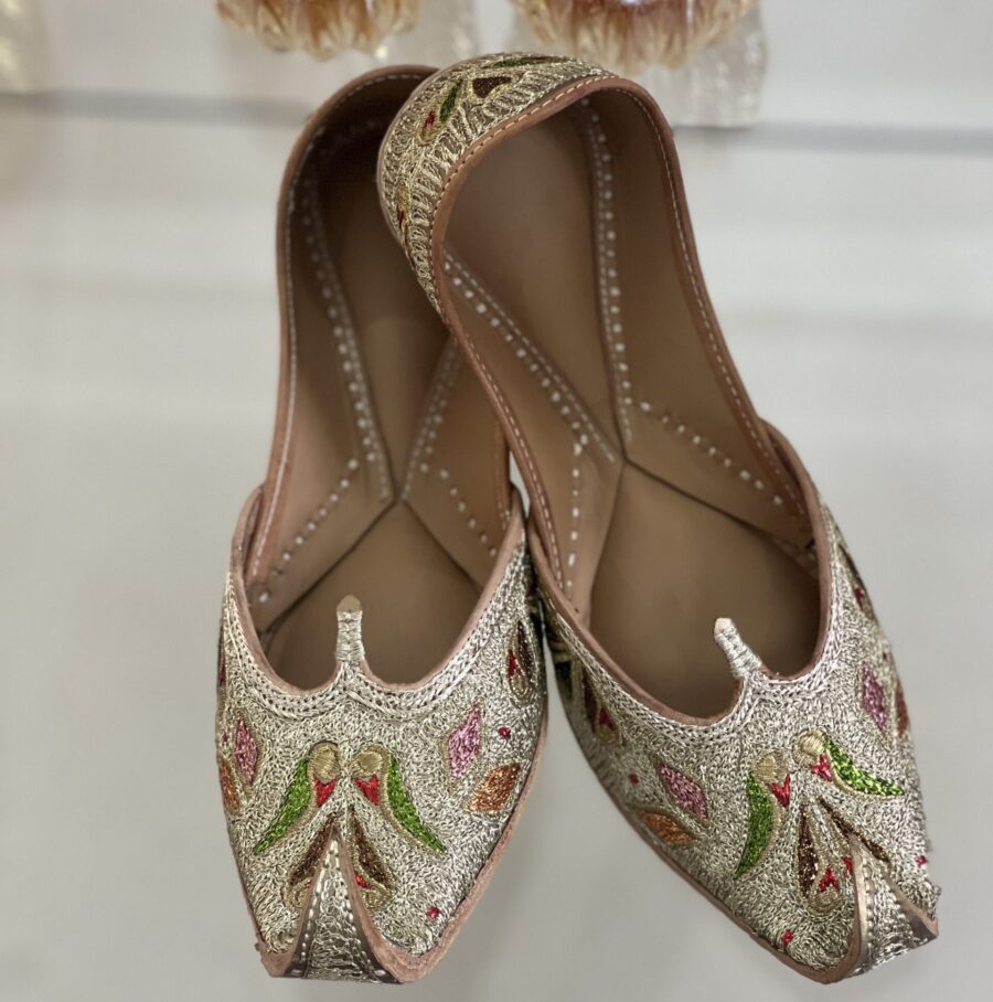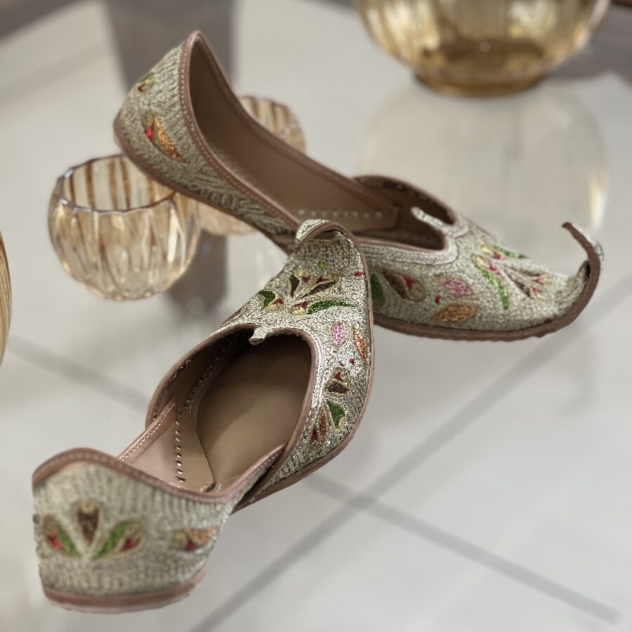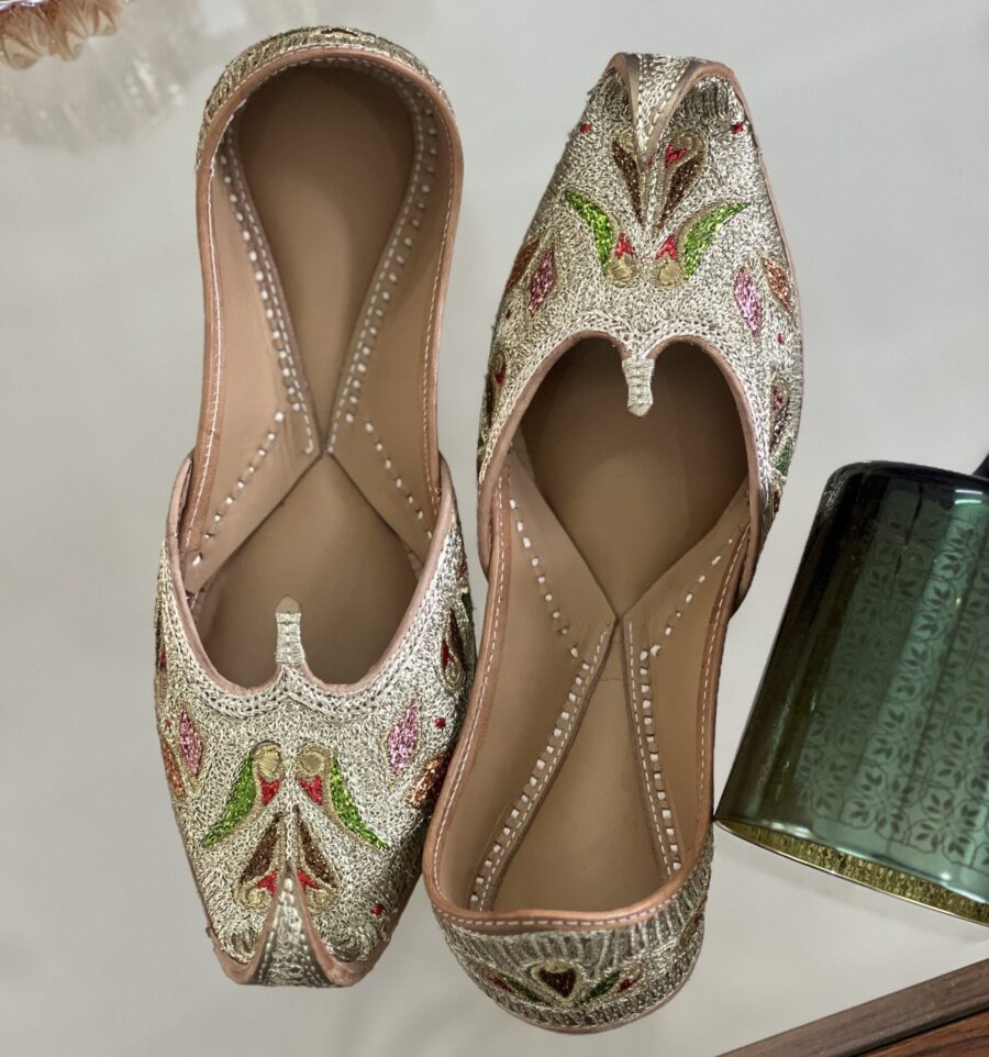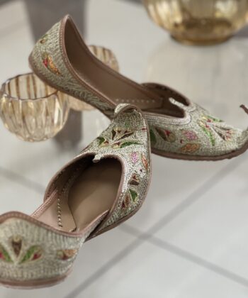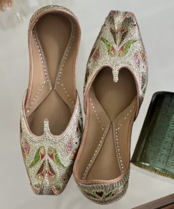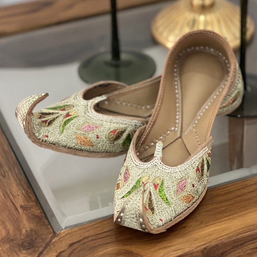 What makes it extraordinary is the intricate Pakistani golden tilla and Aari handwork by Afghan artisans, woven with heritage in every stitch. The rich texture and subtle sheen of this jutti make it the perfect match for bridal lehengas, shararas, or traditional suits.