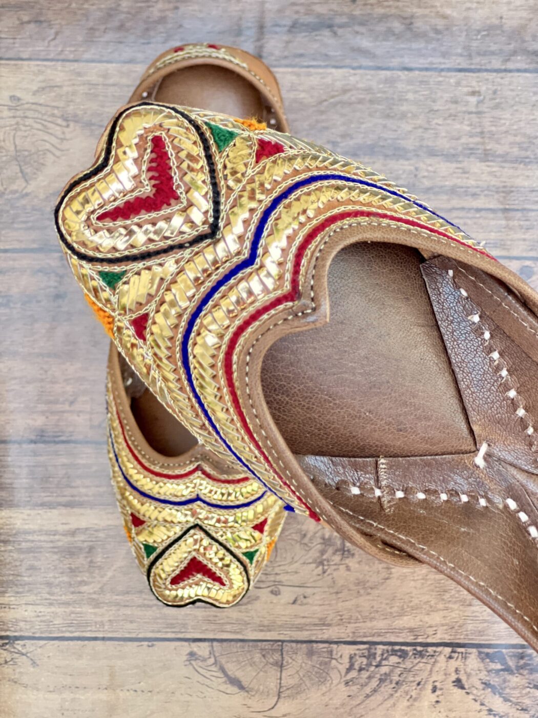 Elevate your festive and formal wardrobe with this multicolored kaseeda handwork with Golden Mukaish Jutti from Sandoori Jutti. Handcrafted using premium quality leather, this stunning pair features combo of rich Golden Heart Mojri mix Mukaish and woolen thread embroidery on a natural brown original leather, offering a perfect blend of tradition and elegance.