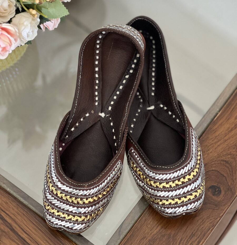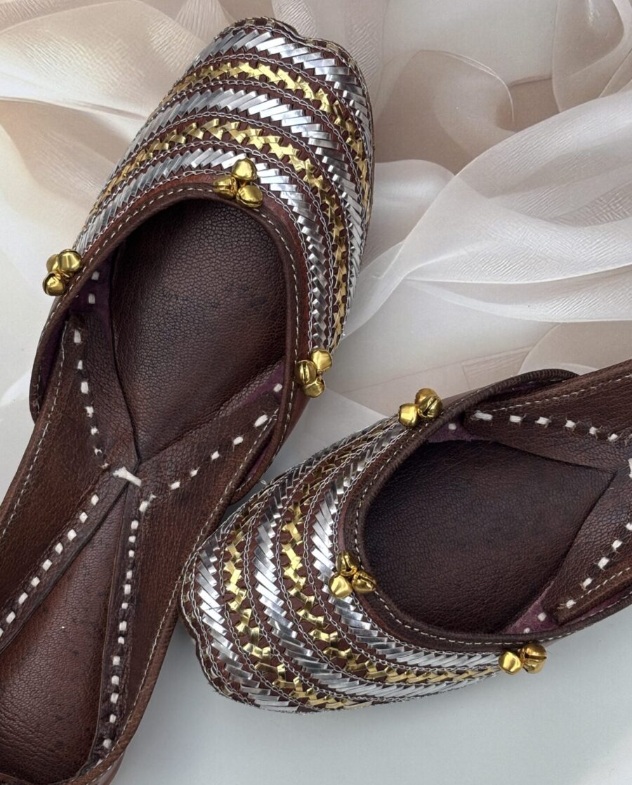 Elevate your festive and formal wardrobe with the Golden Silver mix Mukaishwork Leather Jutti aka Mukaishkali jutti from Sandoori. Handcrafted using premium quality leather, this stunning pair features combo of rich golden and silver Mukaish embroidery on a natural brown origional leather, offering a perfect blend of tradition and elegance.