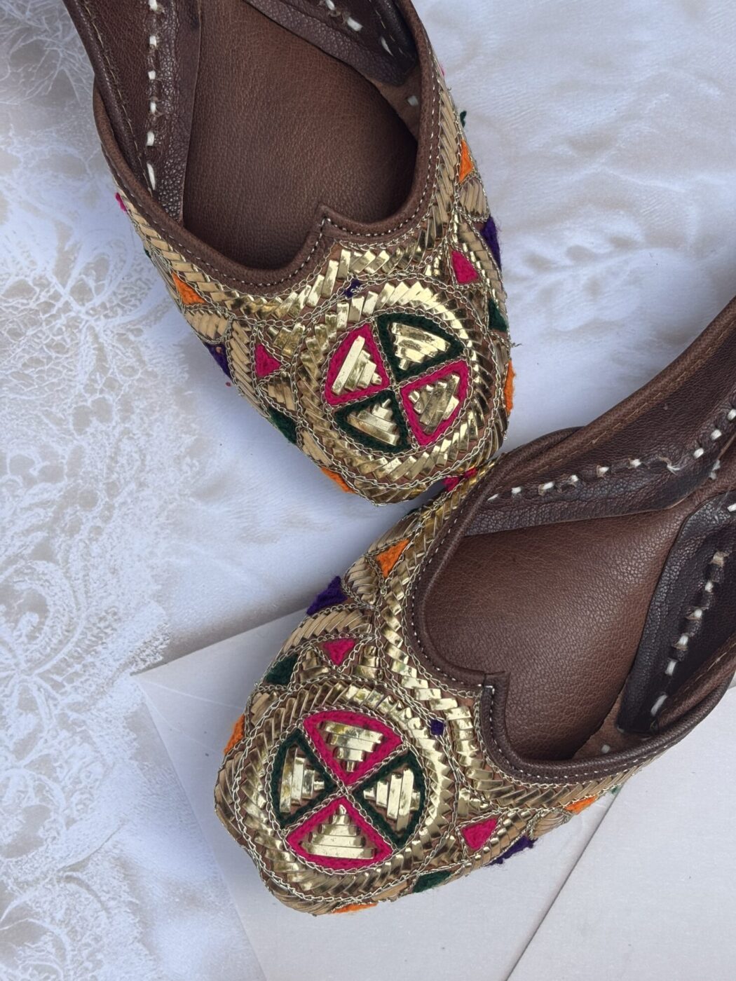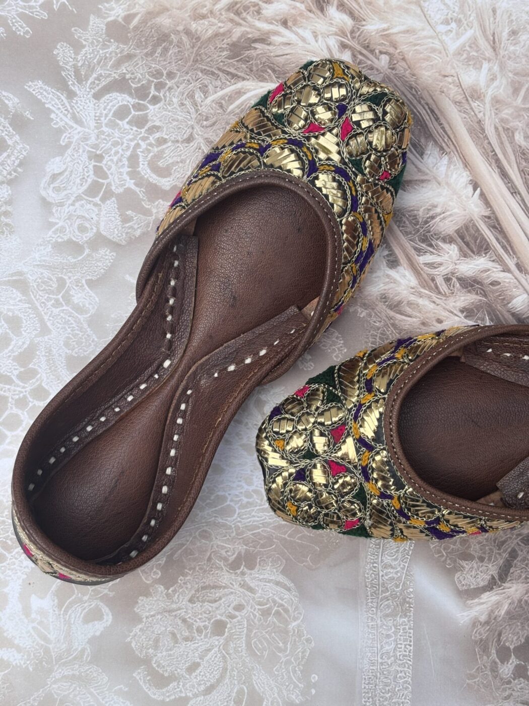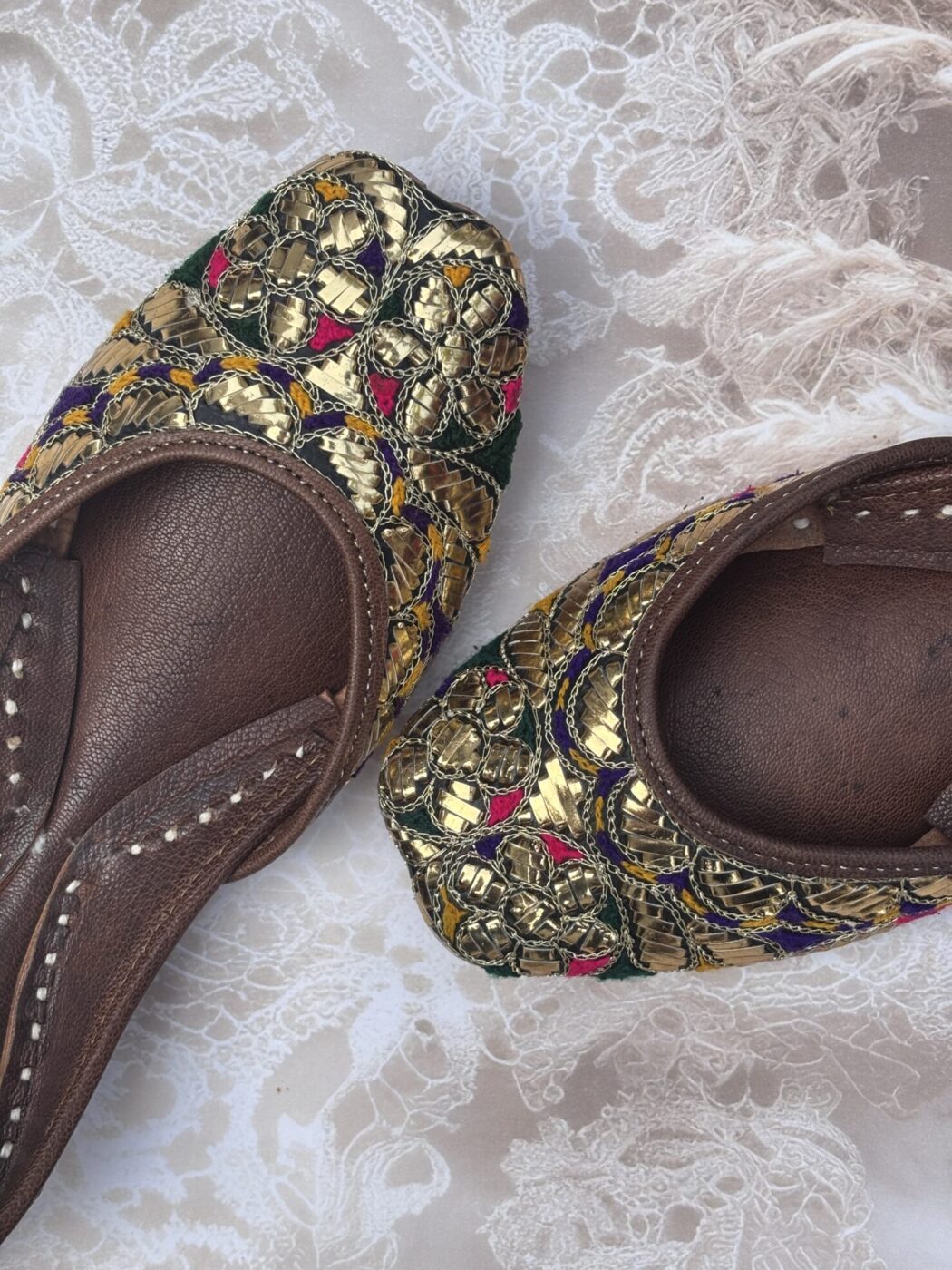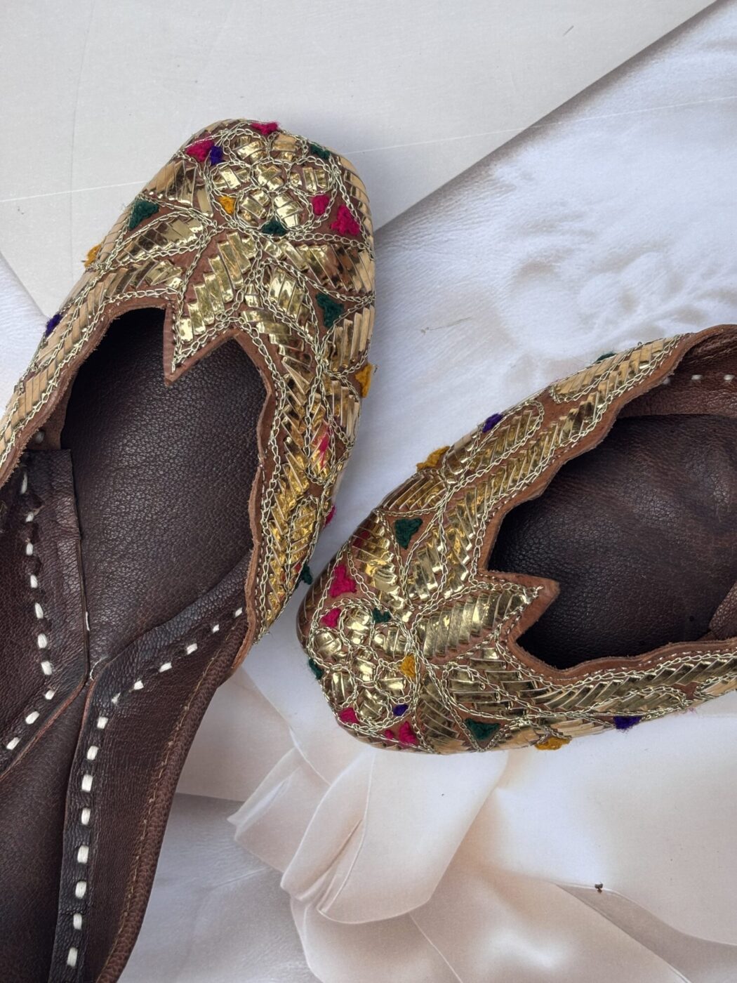 Elevate your festive and formal wardrobe with the Mukaishkali Golden Jutti aka Mukaish work jooti from Sandoori. Handcrafted using premium quality leather, this stunning pair features rich golden Mukaish embroidery on a natural brown origional leather, offering a perfect blend of tradition and elegance.