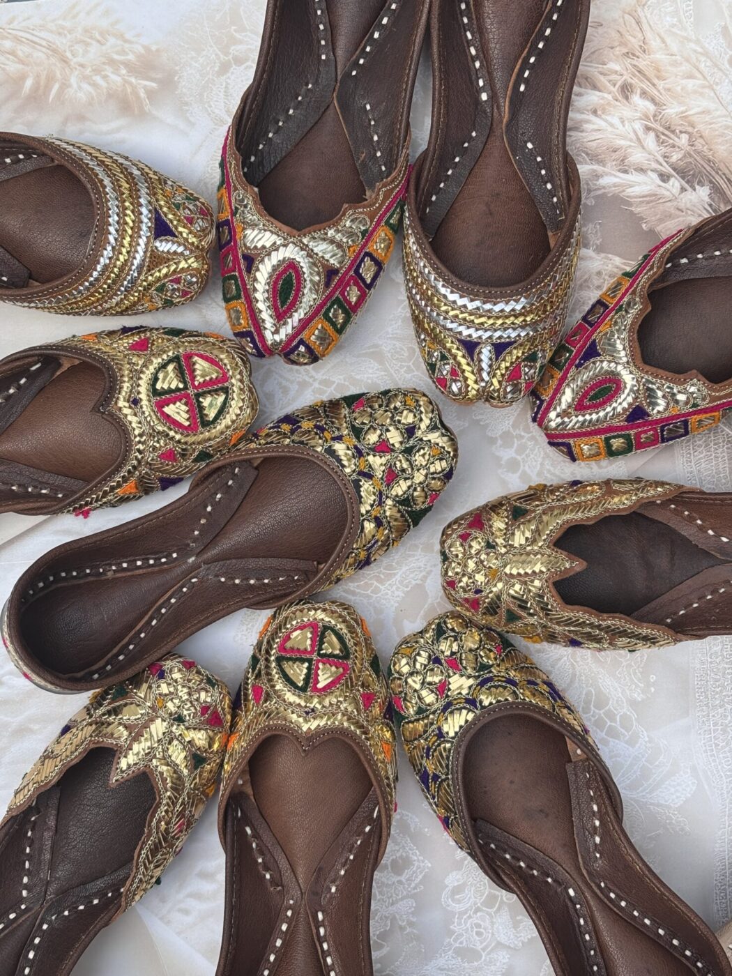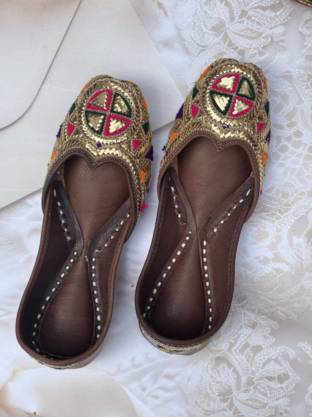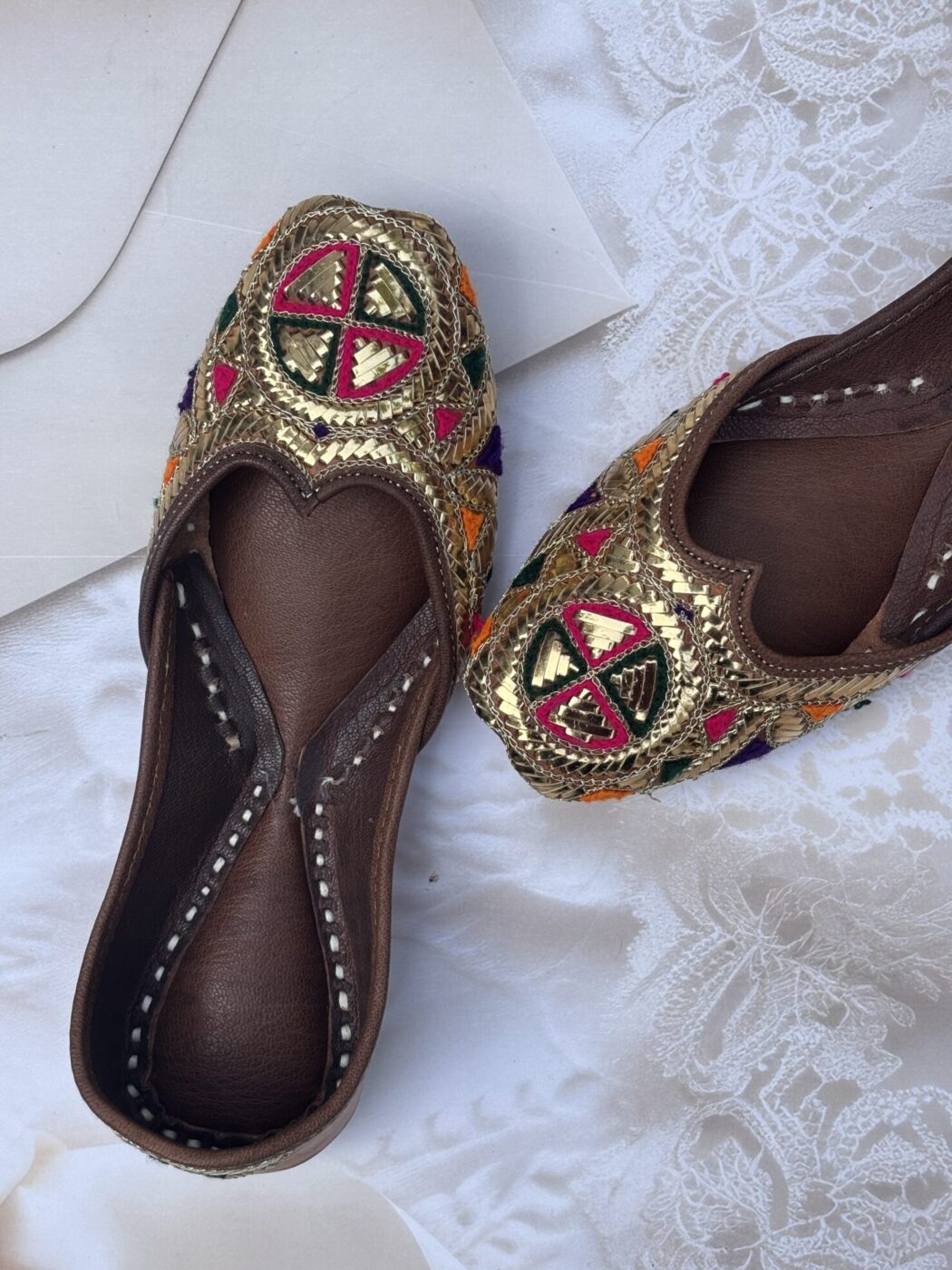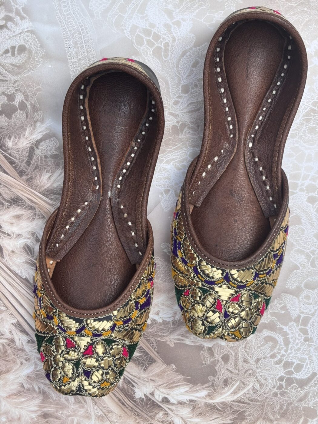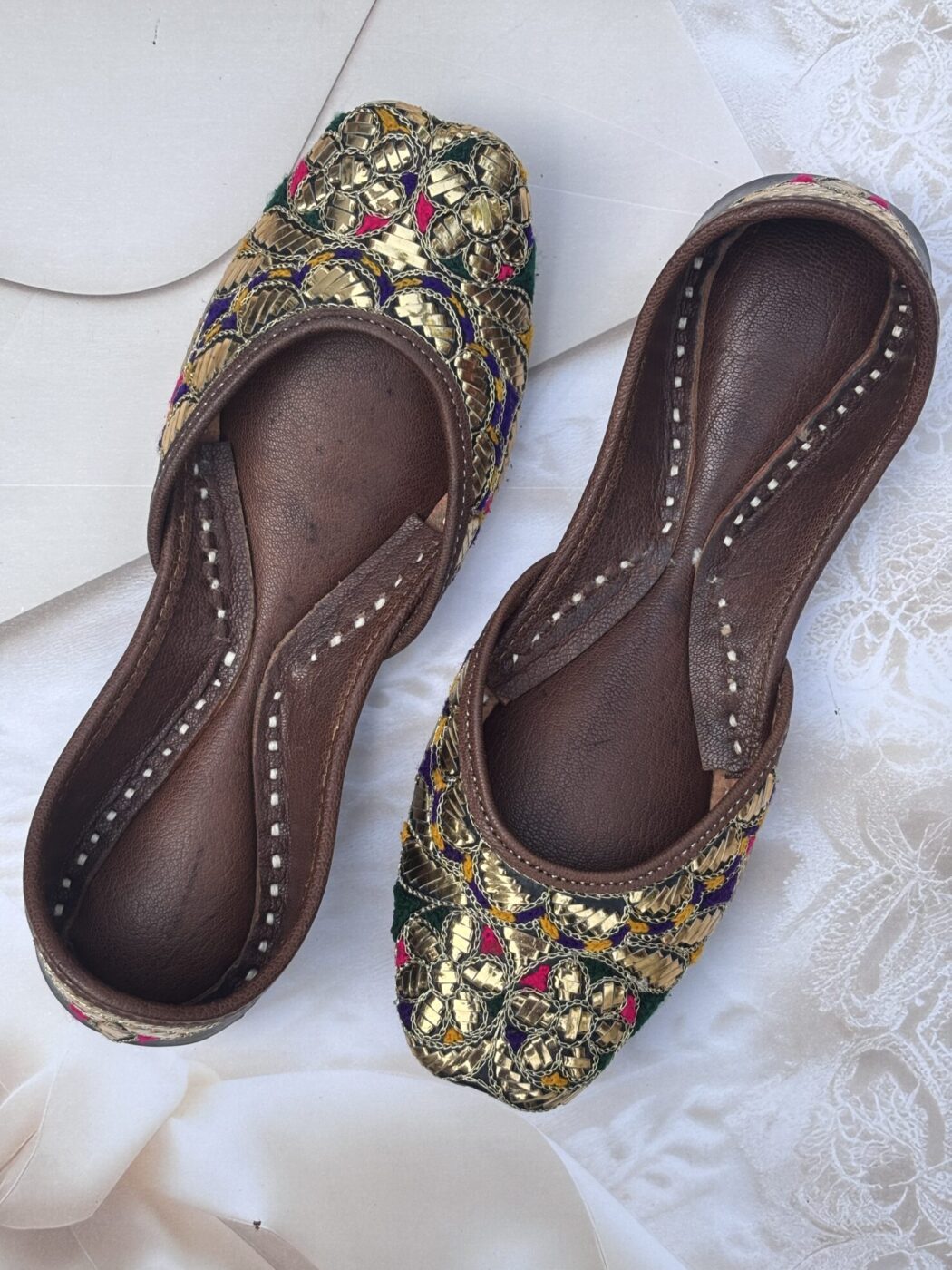 Elevate your festive and formal wardrobe with the Mukaishkali Golden Jutti aka Mukaish work jooti from Sandoori. Handcrafted using premium quality leather, this stunning pair features rich golden Mukaish embroidery on a natural brown origional leather, offering a perfect blend of tradition and elegance.