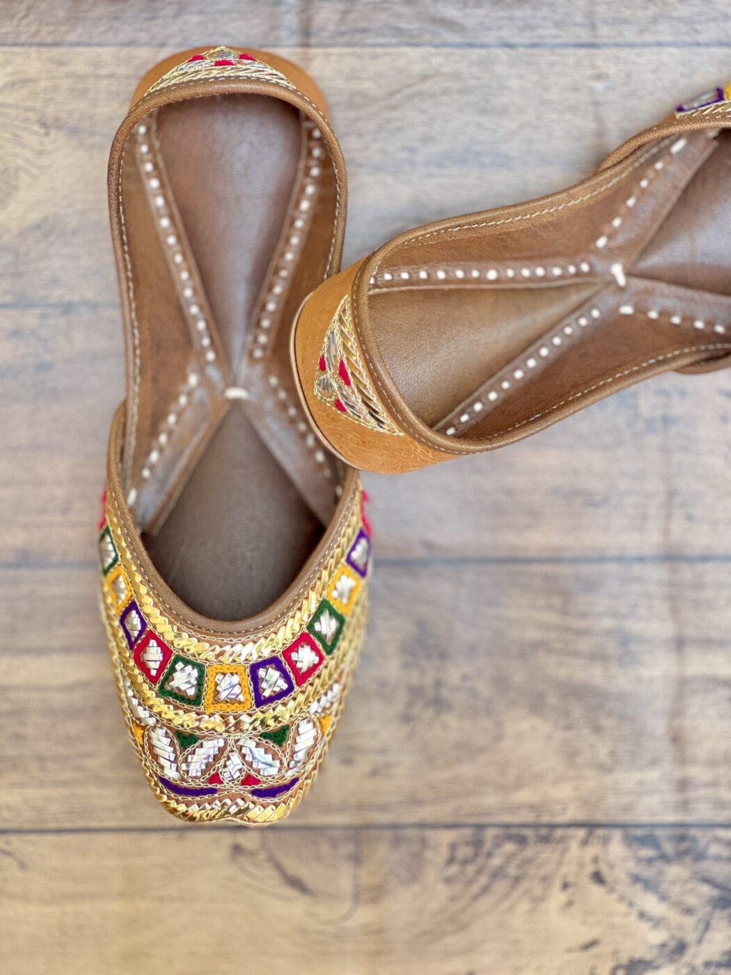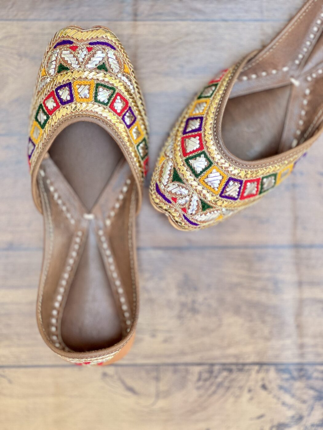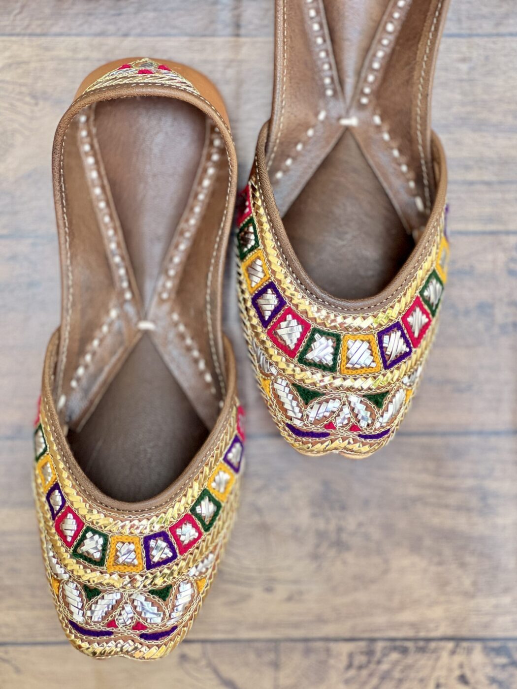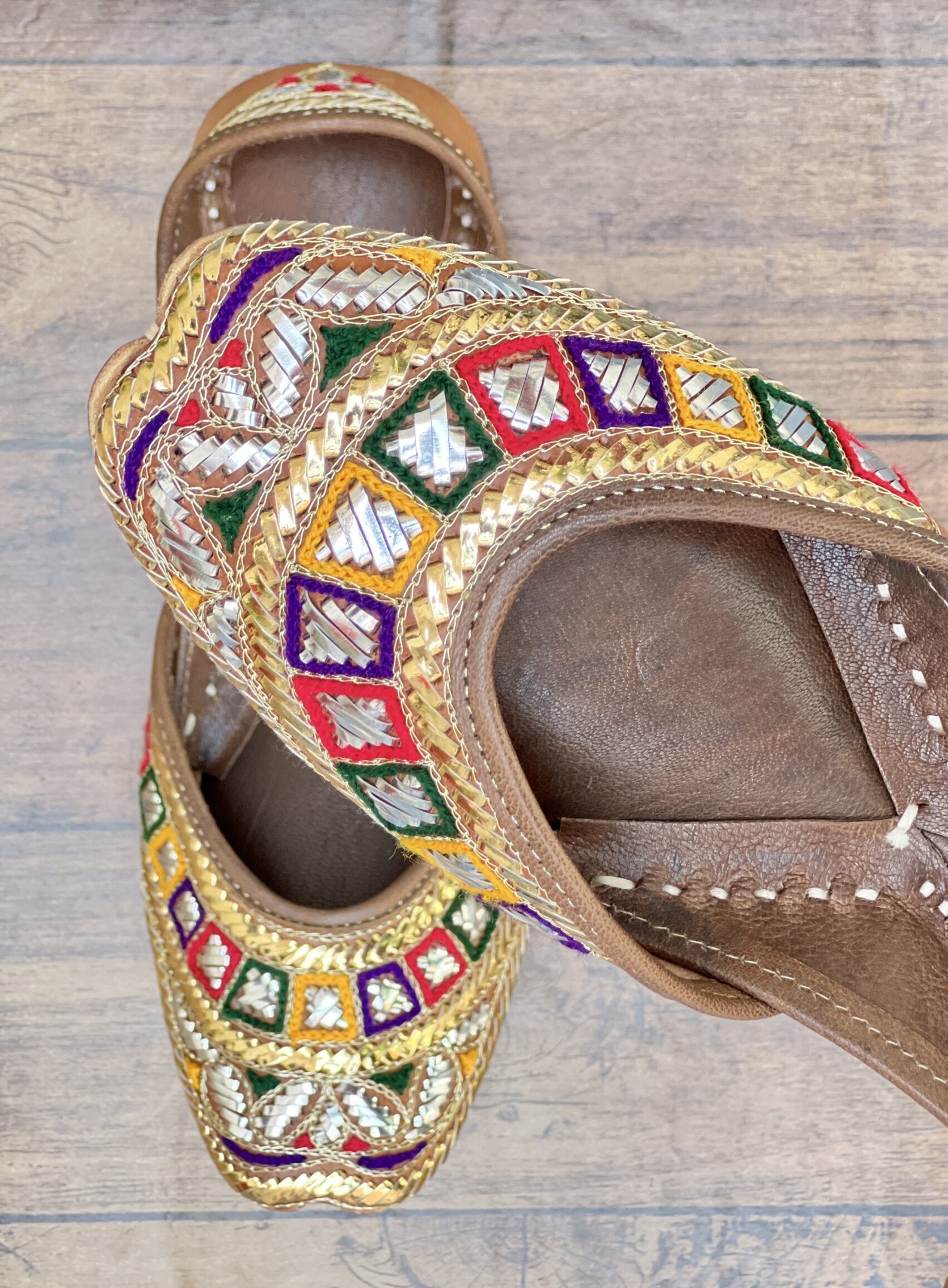 Elevate your festive and formal wardrobe with this multicolored kaseeda handwork with Golden Silver Mukaish Jutti from Sandoori Jutti. Handcrafted using premium quality leather, this stunning pair features combo of rich golden and silver mix Mukaish and woolen thread embroidery on a natural brown original leather, offering a perfect blend of tradition and elegance.