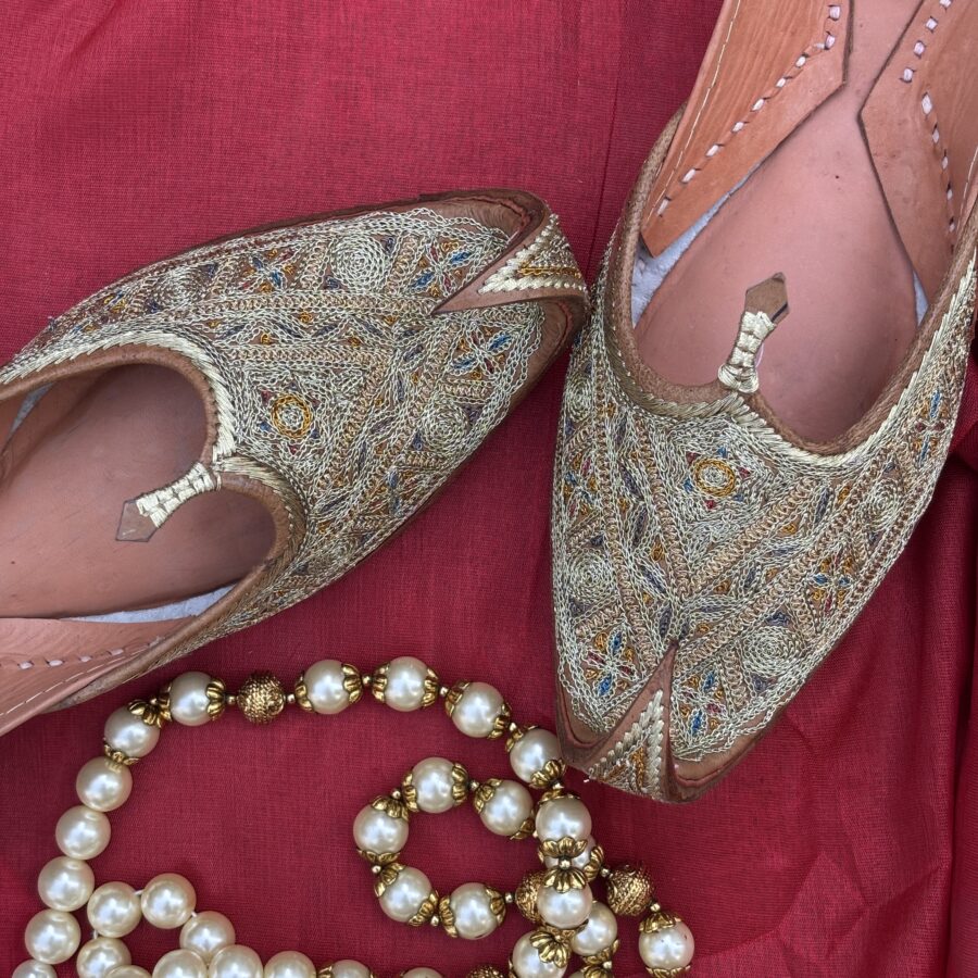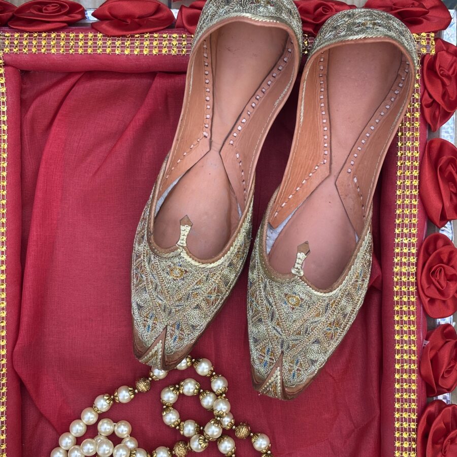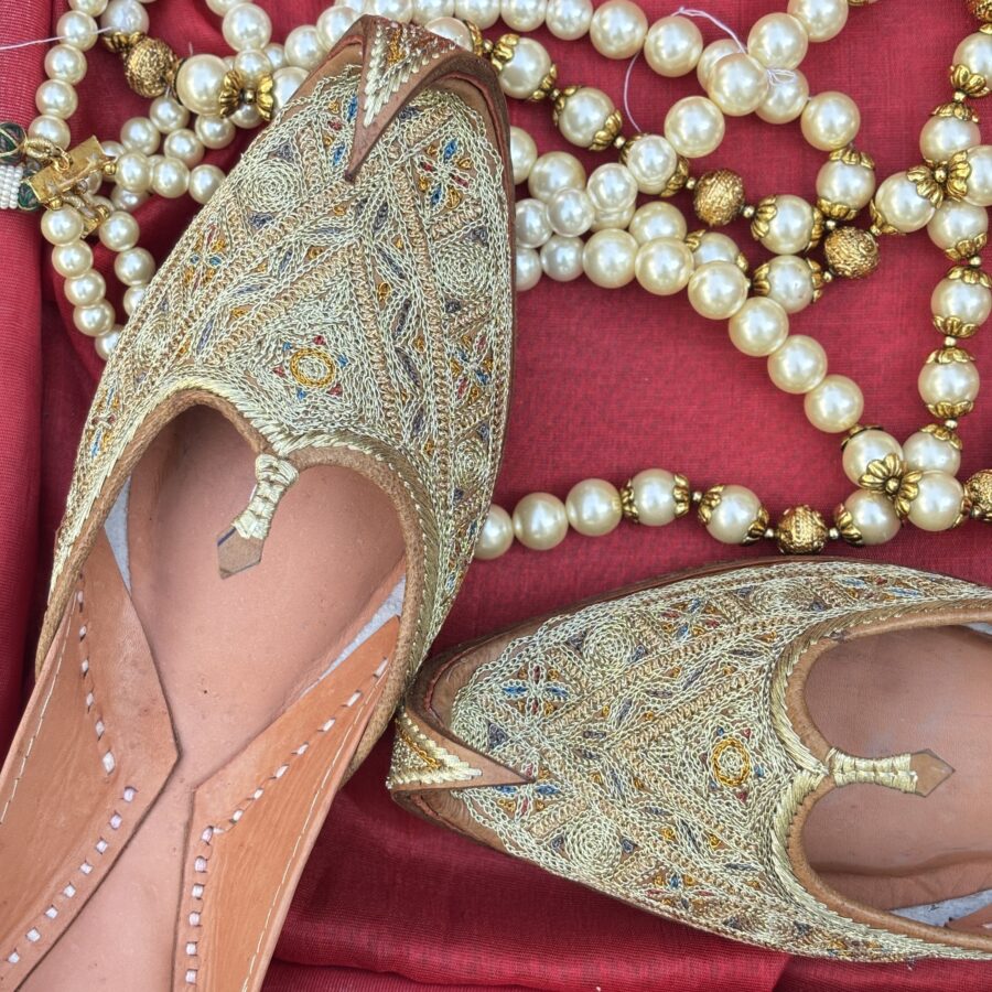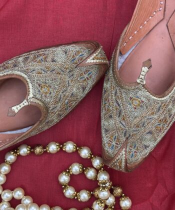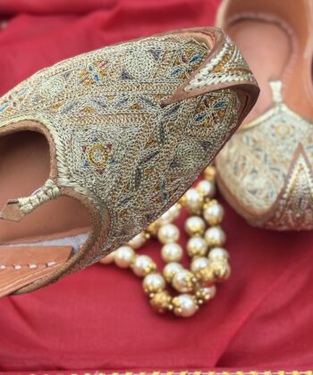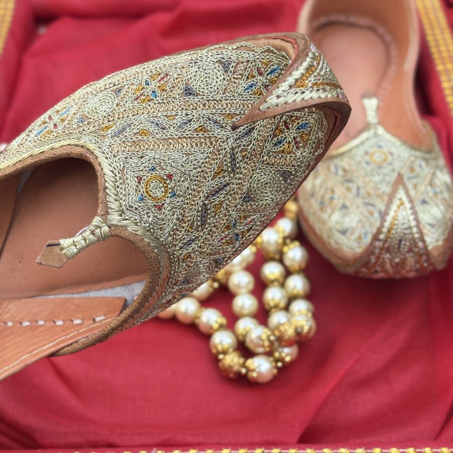 What makes it extraordinary is the intricate Lahori Golden tilla and Aari handwork by Afghan artisans, woven with heritage in every stitch. The rich texture and subtle sheen of this jutti make it the perfect match for bridal lehengas, shararas, or traditional suits.