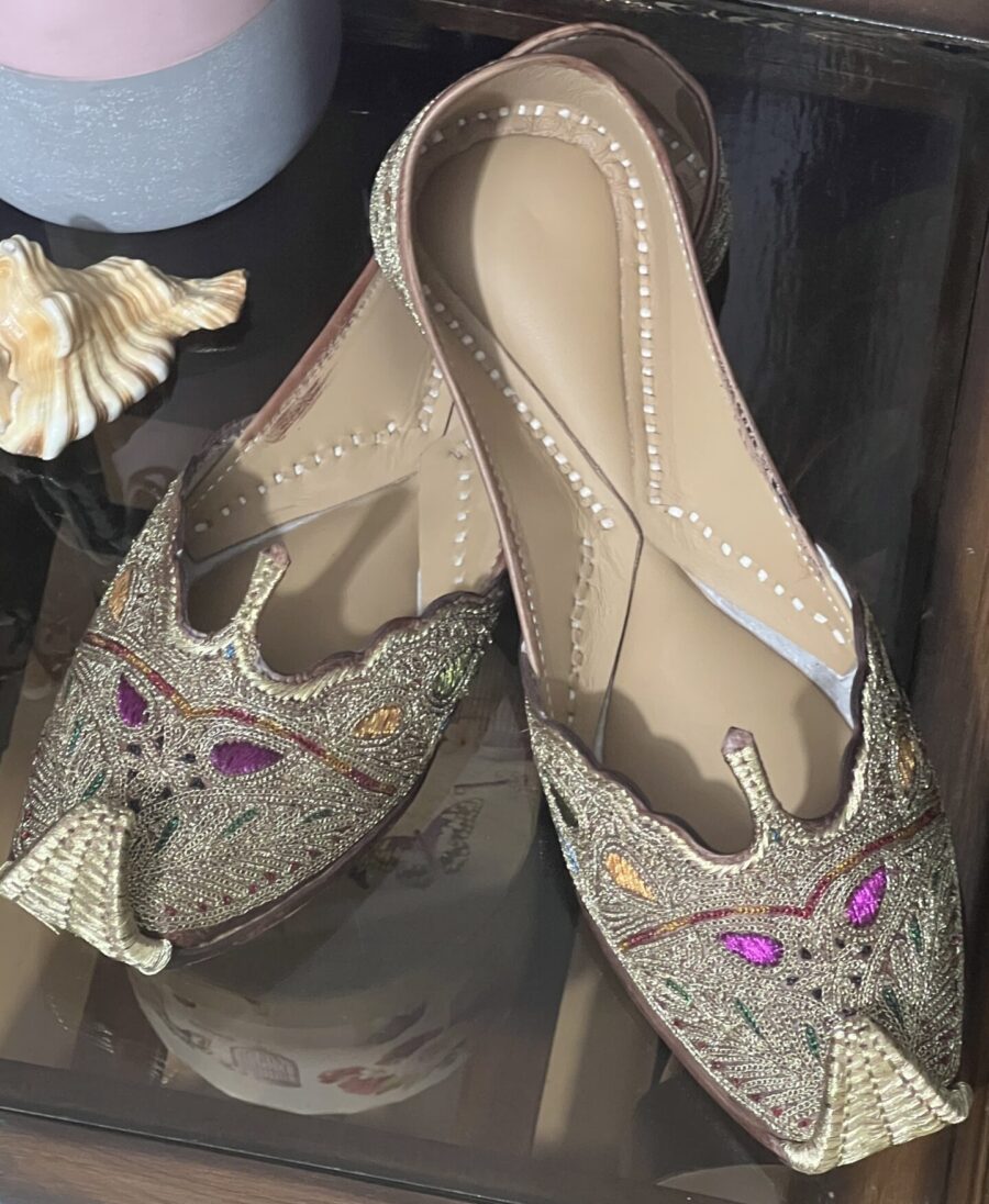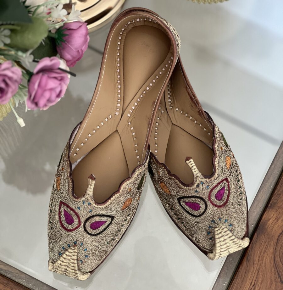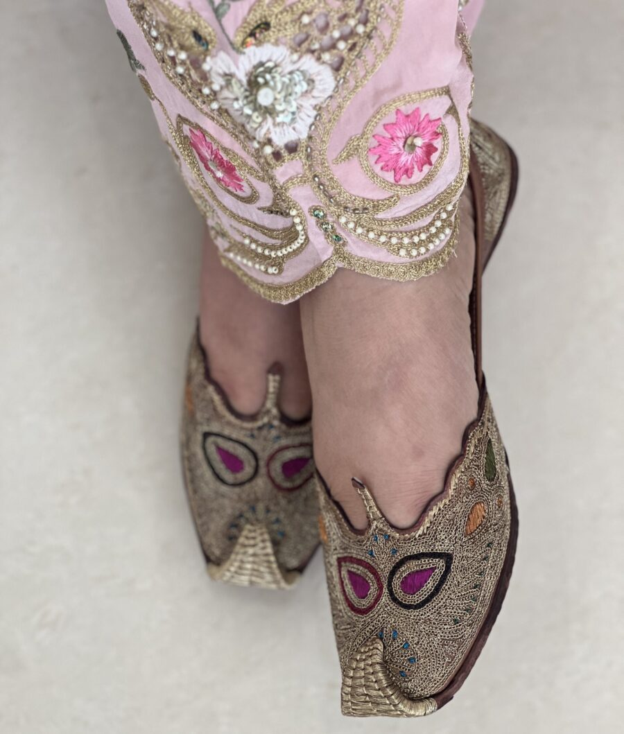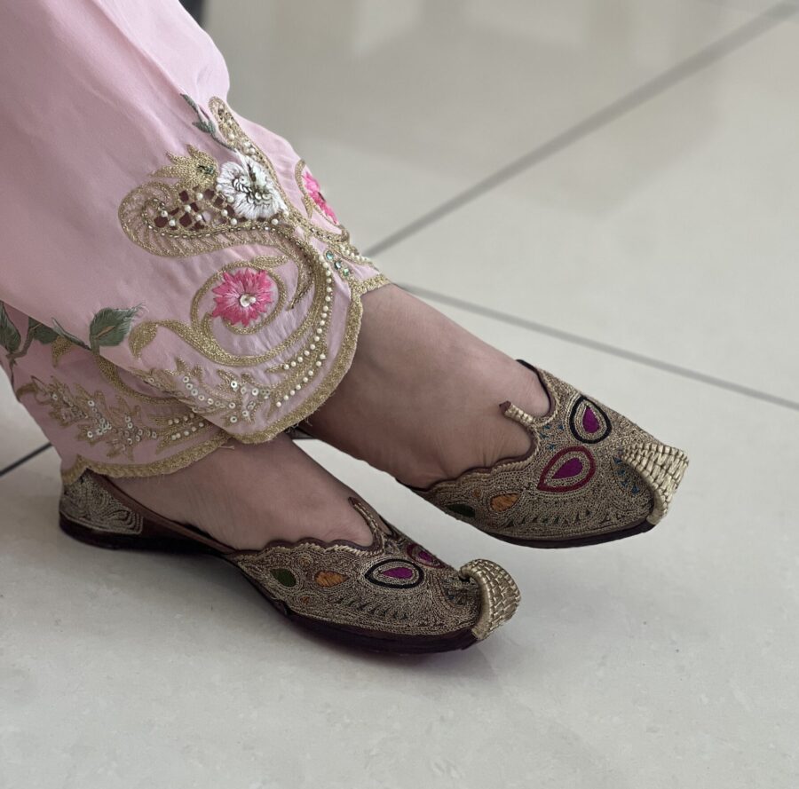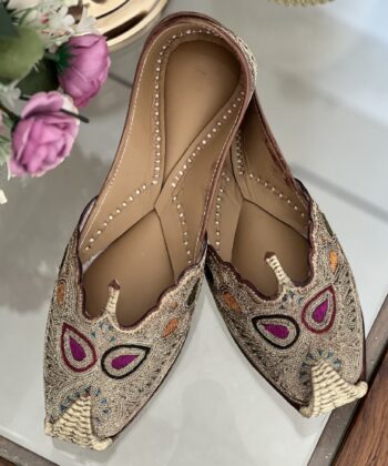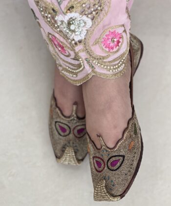 What makes it extraordinary is the intricate Pakistani Golden tilla and Aari handwork by Afghan artisans, woven with heritage in every stitch. The rich texture and subtle sheen of this jutti make it the perfect match for bridal lehengas, shararas, or traditional suits.