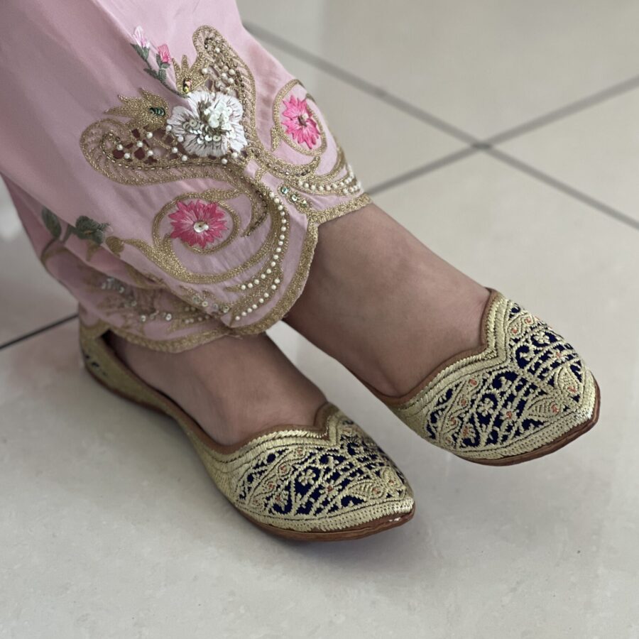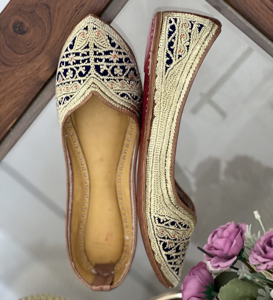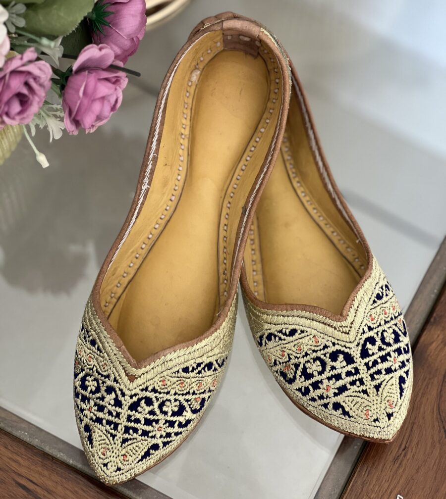 Designed for the modern desi girl, Indigo Mehka combines the edgy charm of Biba fashion with classic craftsmanship. The midnight blue polished leather base features *gold and silver tilla embroidery* in clean, geometric patterns. With a jointless base, straight profile, and subtle arch support, this jutti doesn’t just look sleek—it feels like a second skin.