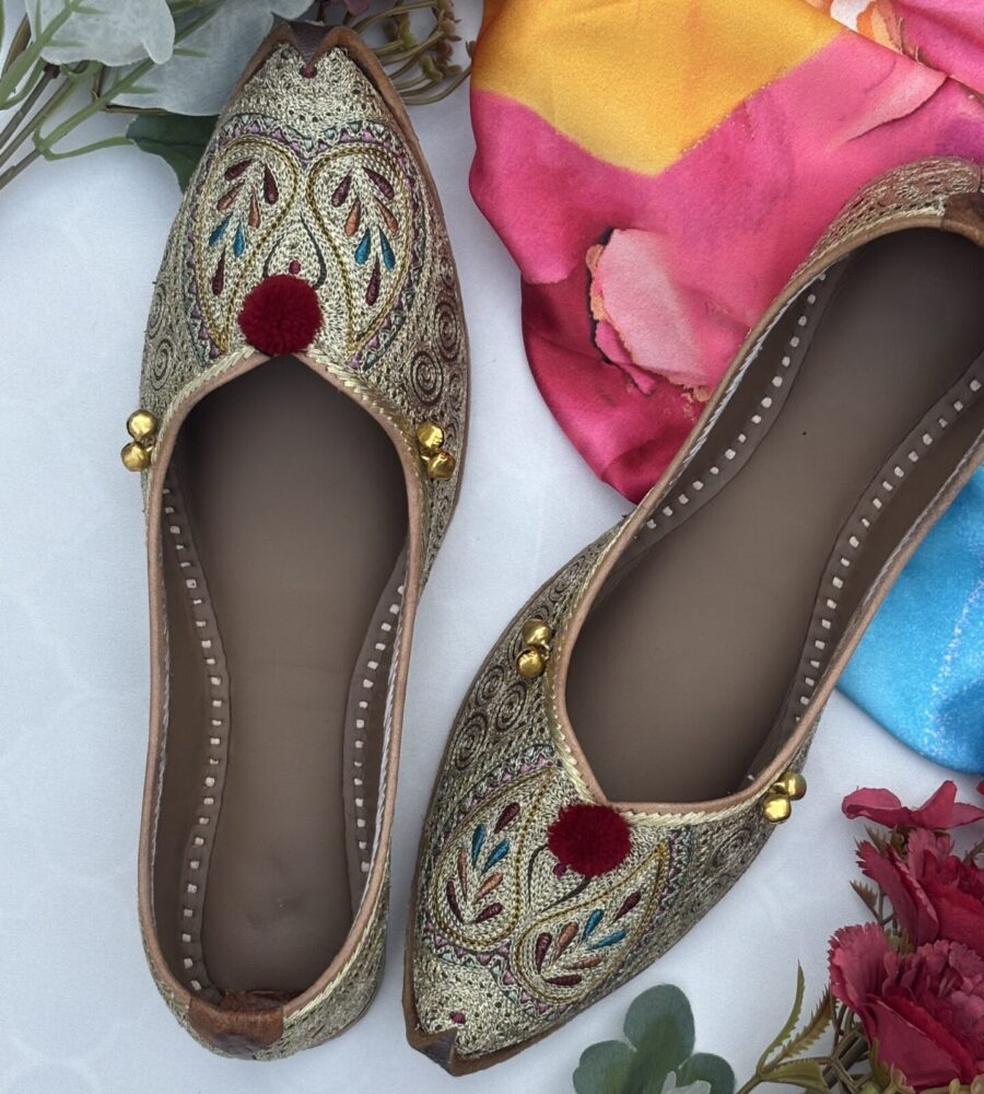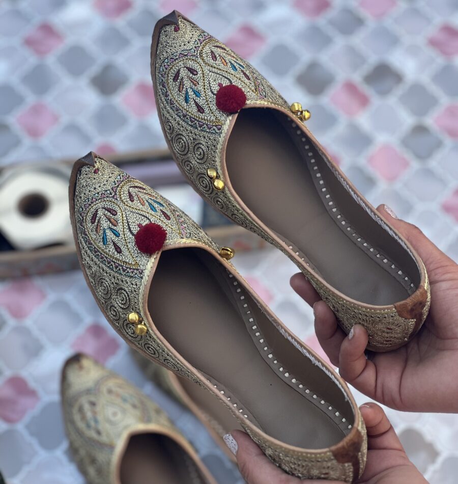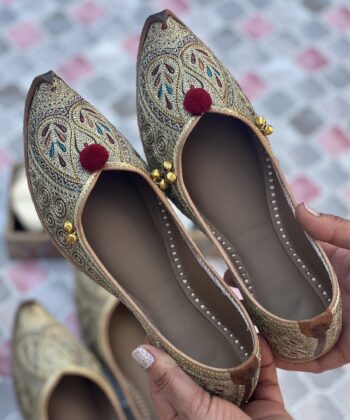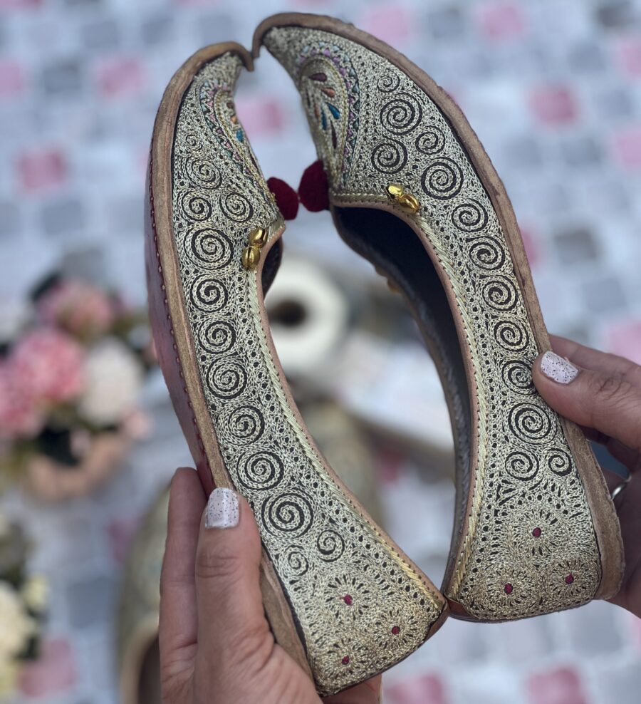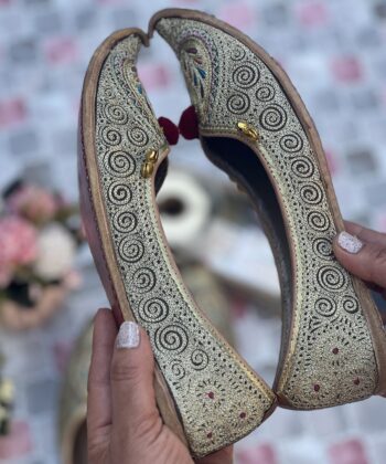 Elevate your ethnic style with our Light Golden Tilla Embroidered Biba Jutti with tiny tip, a stunning blend of tradition and comfort. Lovingly handcrafted by skilled artisans, this Punjabi jutti, also known as mojari or Delhi fashion jutti, is made from the finest single-piece, joint-less pure leather, ensuring unmatched durability and a flawless finish.