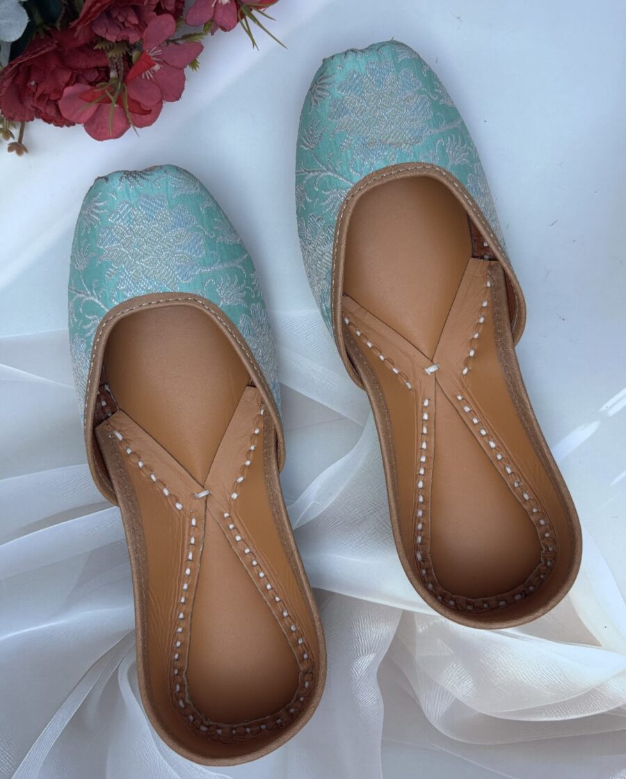 Adorn your feet with our exquisite collection of Brocade Juttis, designed to blend tradition with modern elegance. Crafted from premium brocade fabric and adorned with intricate embroidery, these juttis are perfect for weddings, festivals, or adding a regal touch to everyday outfits. Each pair features a soft cushioned solefor all-day comfort, a flexible leather base, and a snug fit tailored for women seeking lightweight, breathable footwear. Available in Baby Pink, Off-White, Phirozy, Sea Green, and Green, these juttis celebrate vibrant hues and Mughal-inspired artistry.