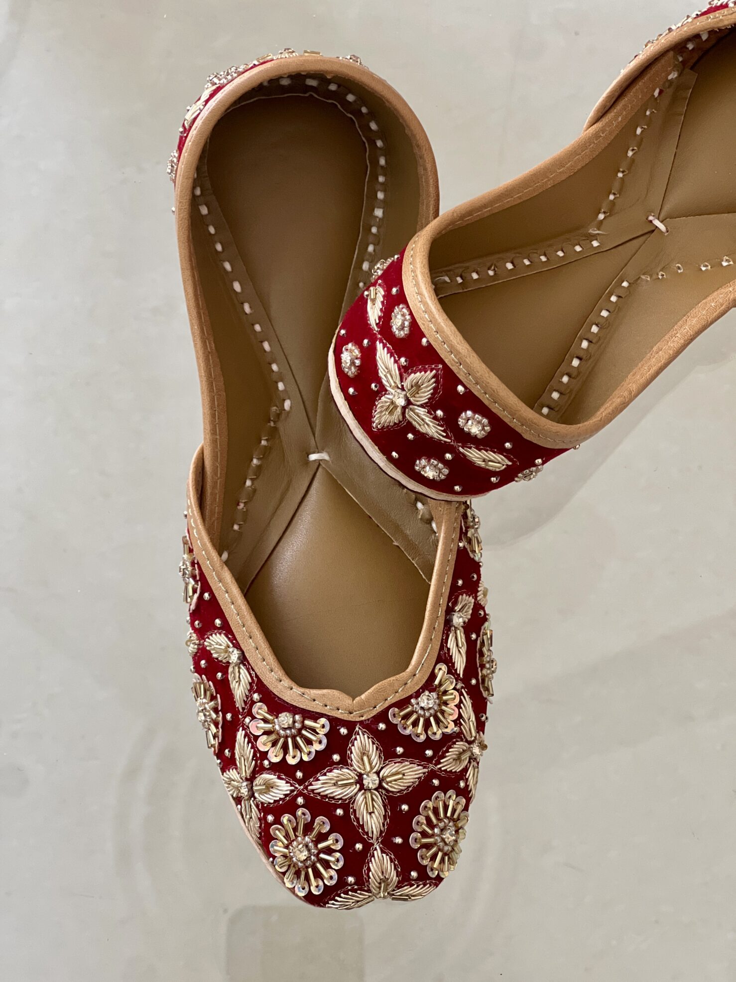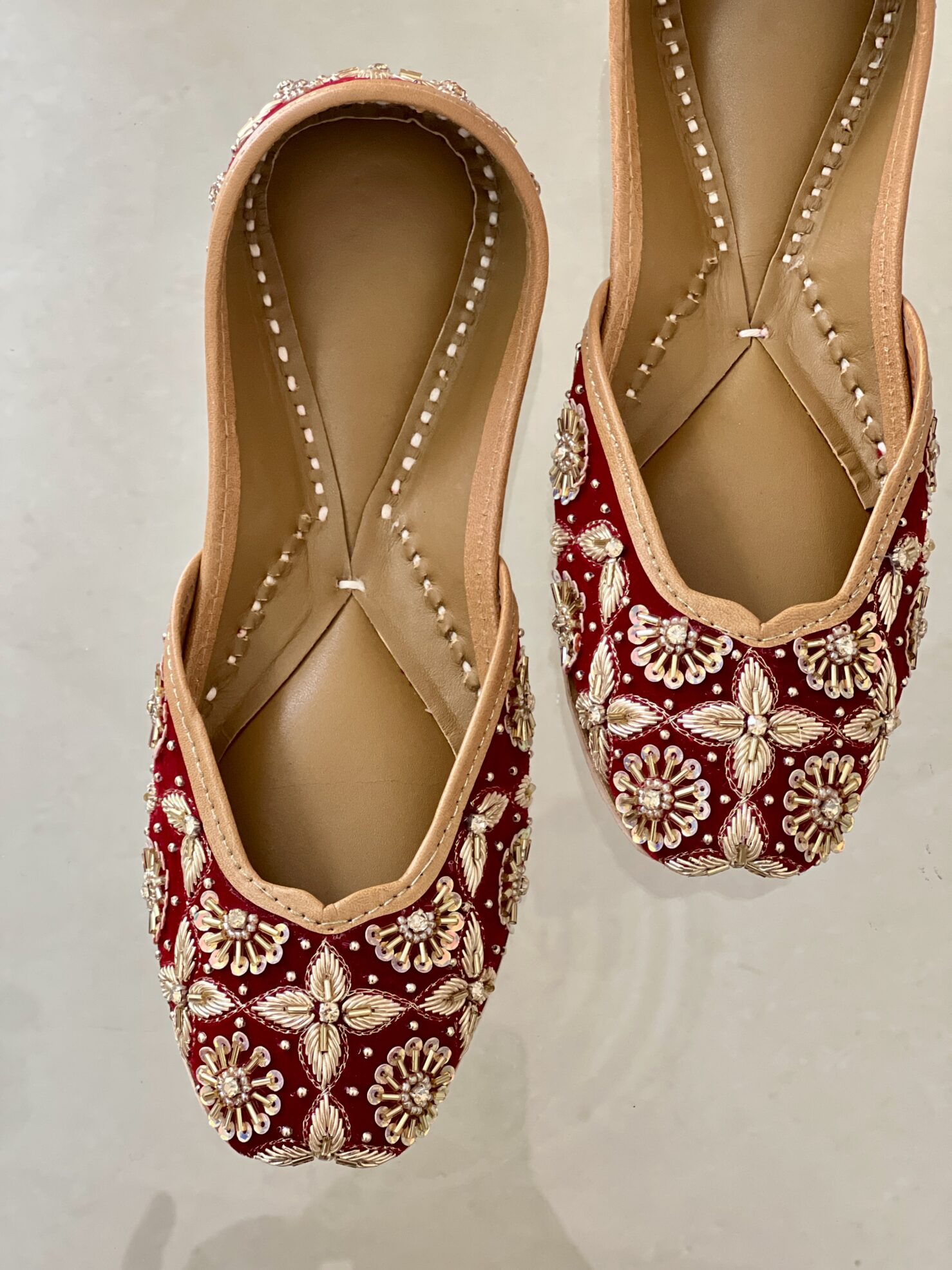 Opulent Maroon Velvet Base Golden Jutti Dabka handwork – Royal Elegance, Handcrafted.