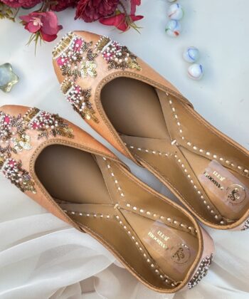 Add a touch of grace to your steps with our stunning Peach Punjabi Jutti, beautifully adorned with antique cutdana and golden sequins. Hand-stitched with precision and crafted from original leather, this jutti promises both timeless charm and all-day comfort.