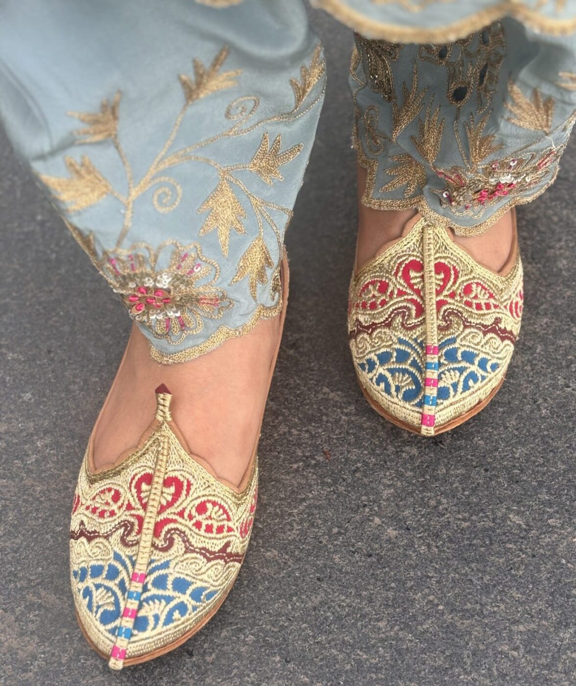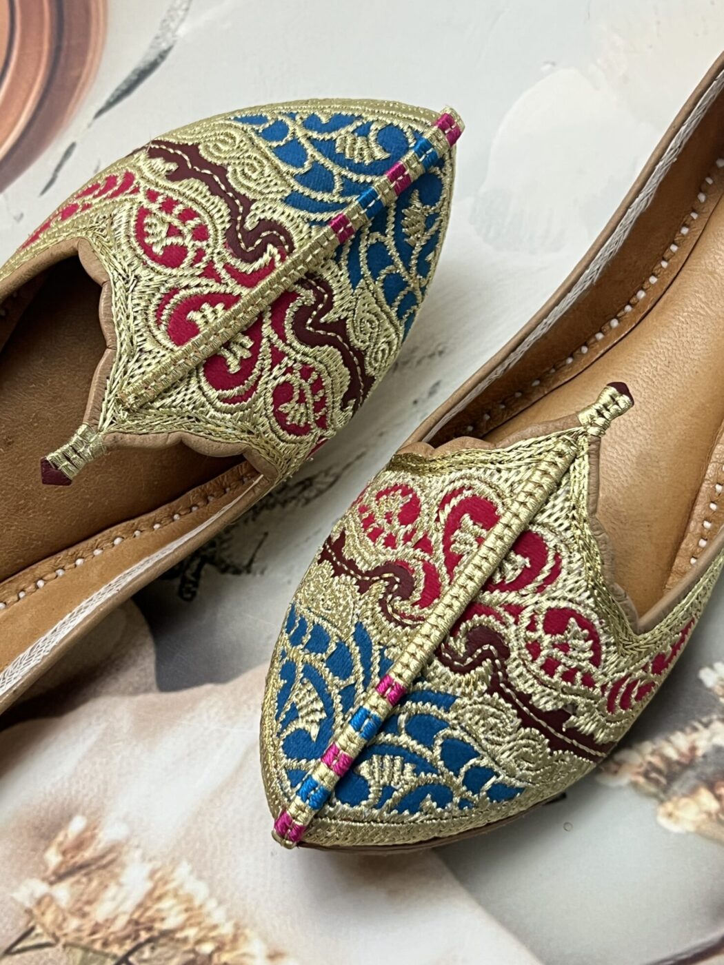Elevate your ethnic style with our Biba Jutti with Phirozy and Magenta velvet inserts and hand embroidered with Golden tilla (Zari). A stunning blend of tradition and comfort. Lovingly handcrafted by skilled artisans, this Punjabi jutti, also known as mojari or Delhi fashion jutti, is made from the finest single-piece, joint-less pure leather, ensuring unmatched durability and a flawless finish.