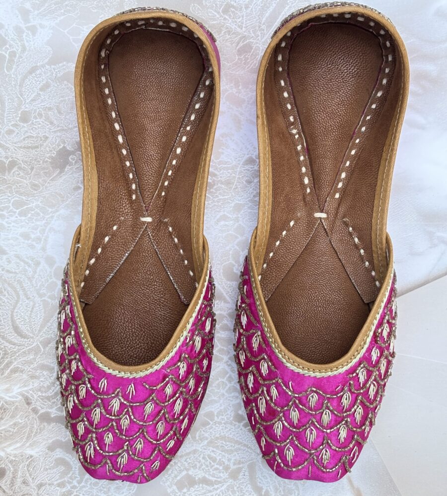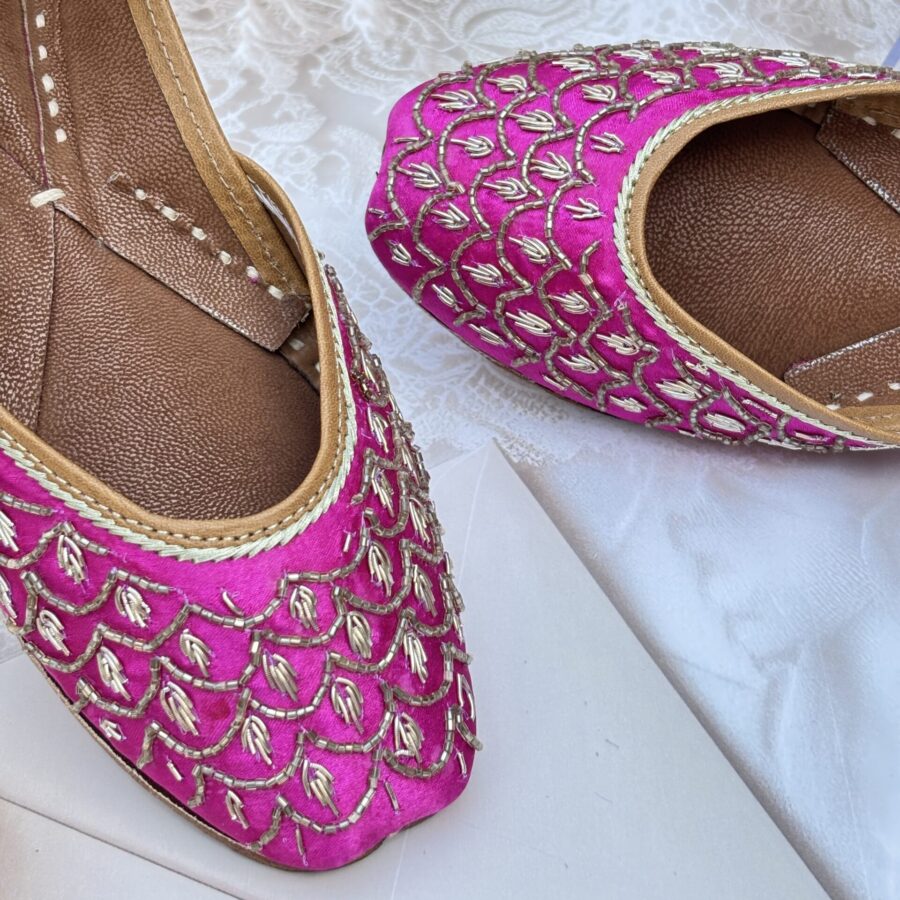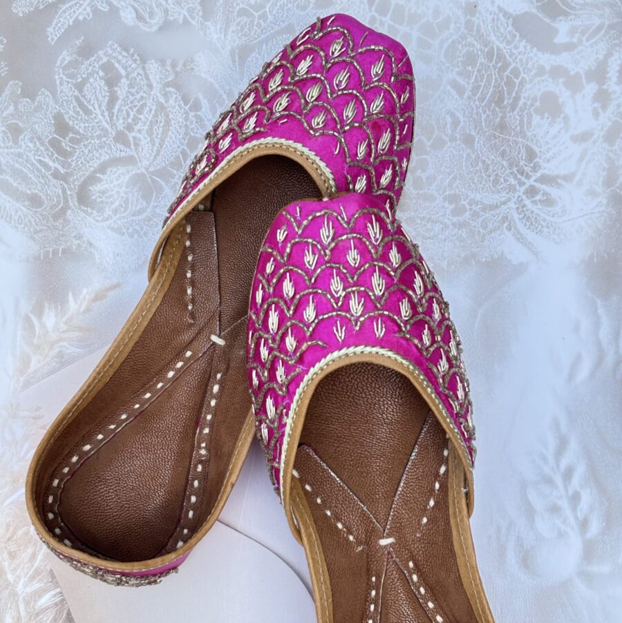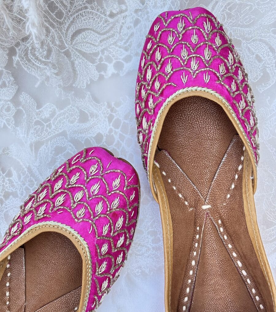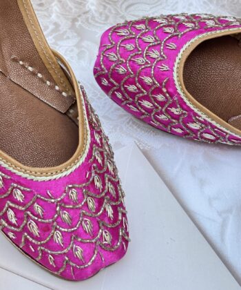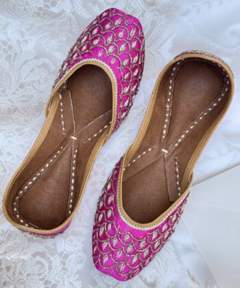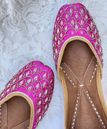 Introducing our exquisite Hot Pink Punjabi Juttis, a harmonious blend of traditional craftsmanship and contemporary style. These handcrafted juttis feature a vibrant hot pink base adorned with intricate golden dabka embroidery, shimmering golden sequins, and delicate cutdana work, creating a captivating design that exudes elegance and charm.