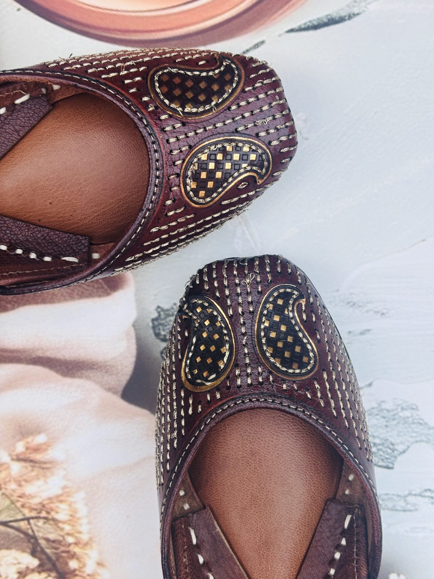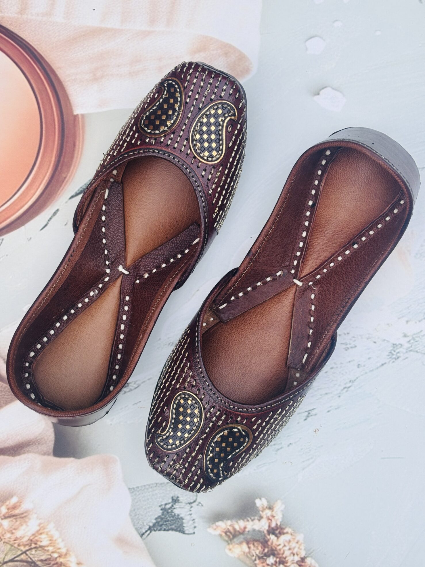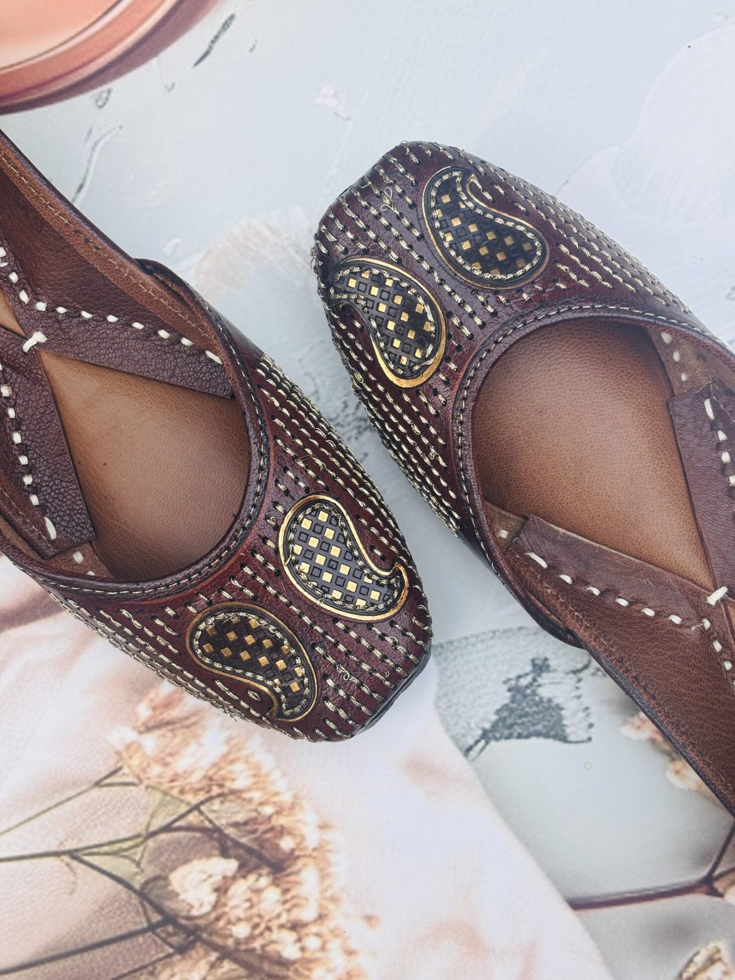 Everyday Comfort Juttis for ladies : Brown Juttis with Golden Tilla Handwork, Bold. Beautiful. Built to turn heads.