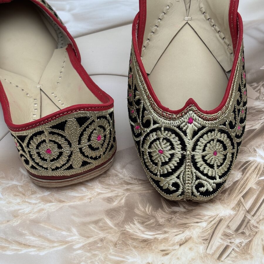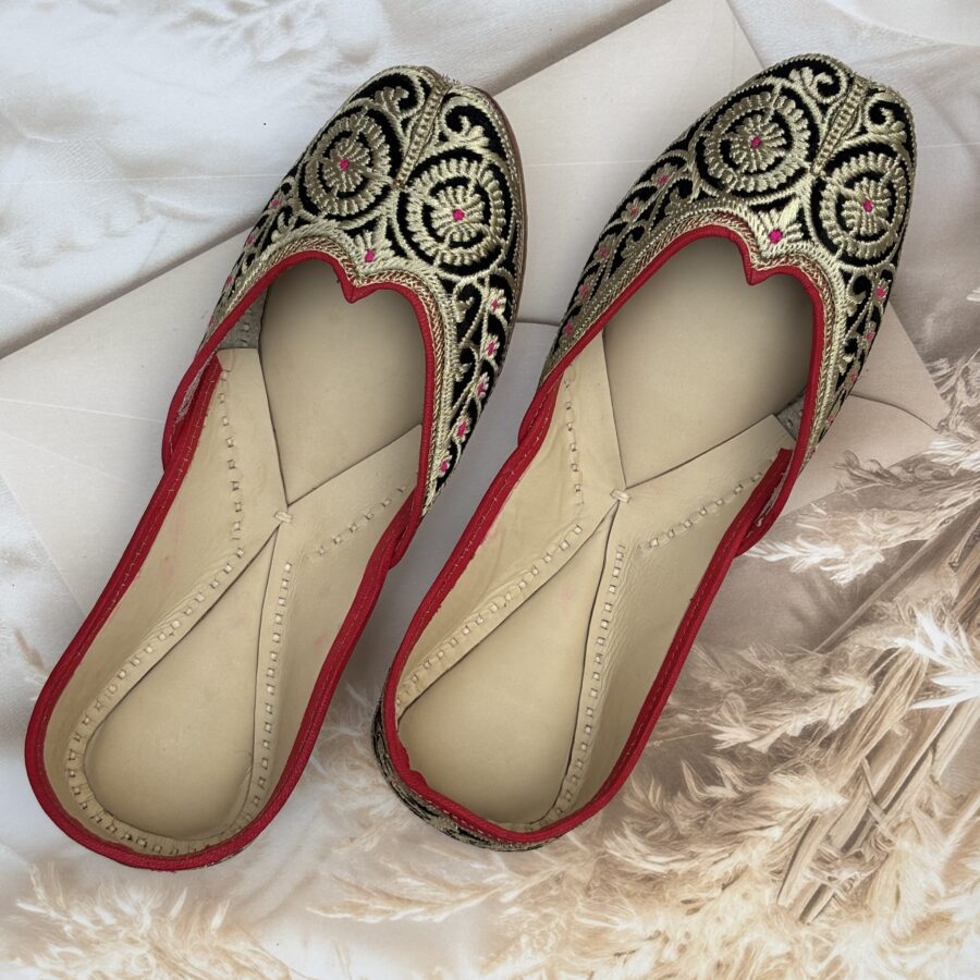 Step into timeless elegance with our Silver Tilla Black Jutti Circle Pattern for Women. Handcrafted to perfection, this traditional jutti features: