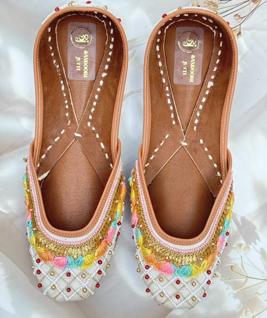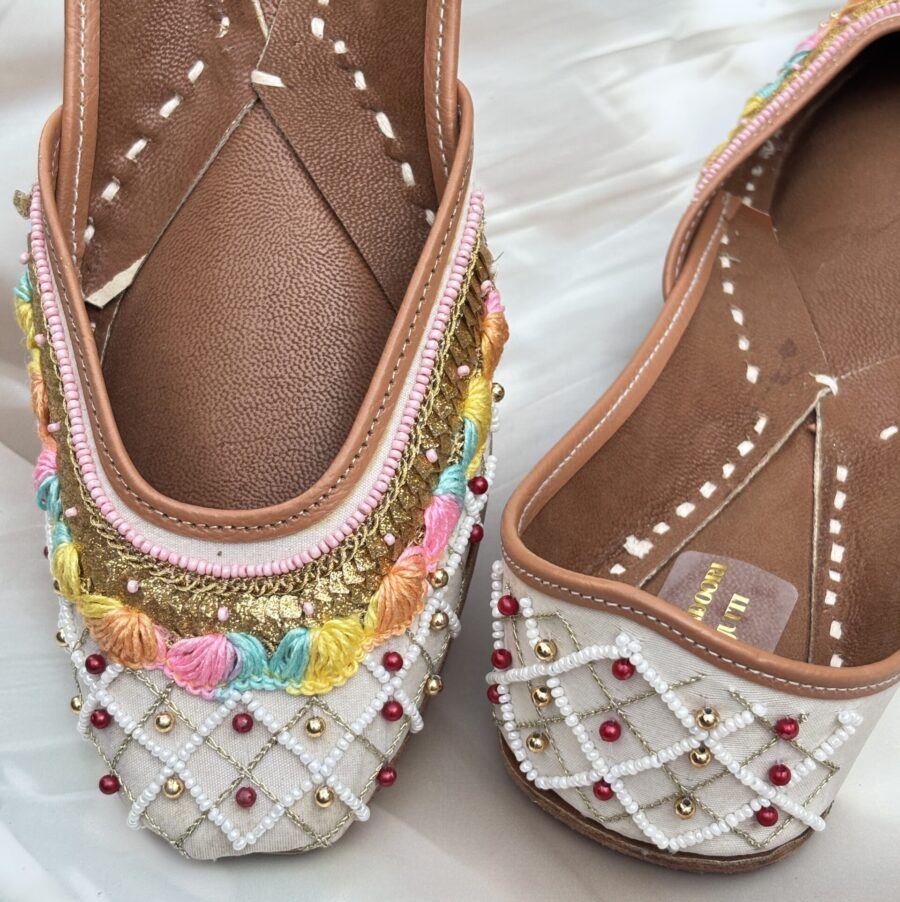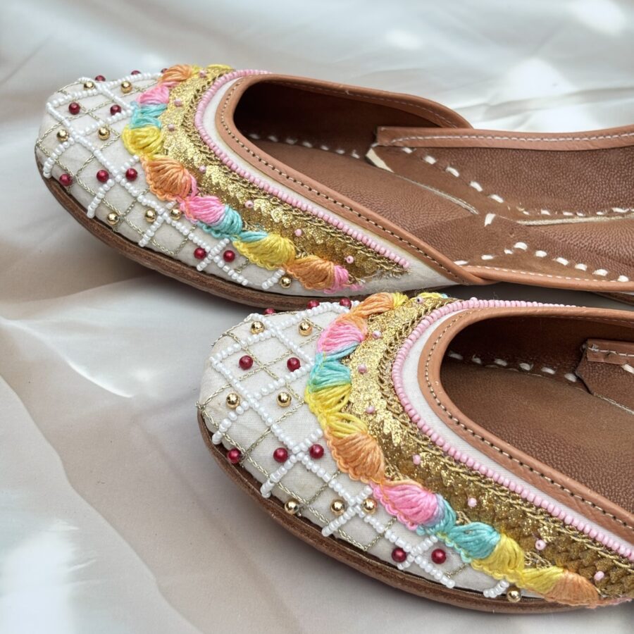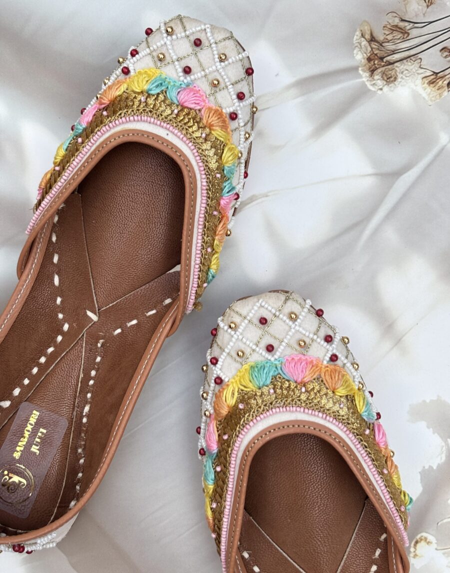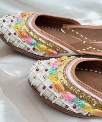 Step into grace and comfort with our White Base Punjabi Juttis, beautifully adorned with pink & white pearls, intricate multicolor thread embroidery, and shimmering golden gota work. These handcrafted juttis are a perfect combination of tradition and contemporary charm, designed to elevate any outfit effortlessly.