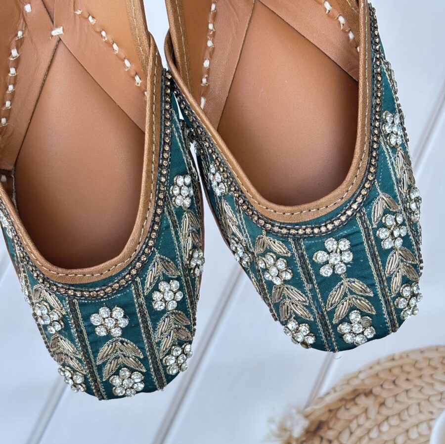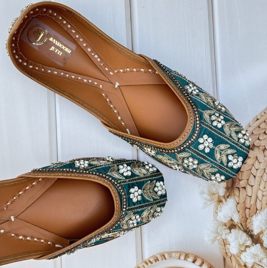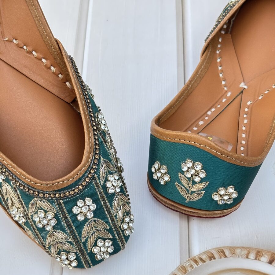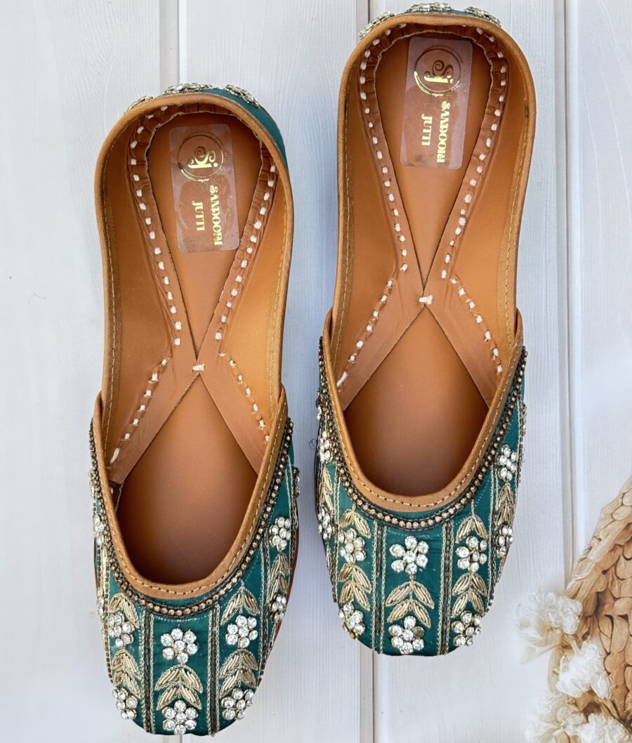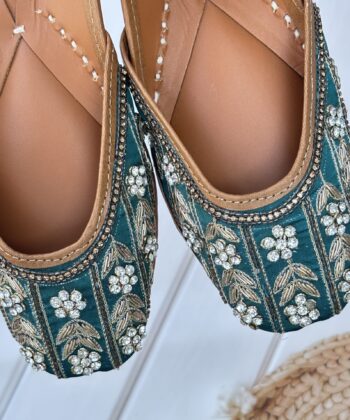 Step into a world of elegance and comfort with these exquisite Teal Green Punjabi Juttis, where traditional design meets modern sophistication.