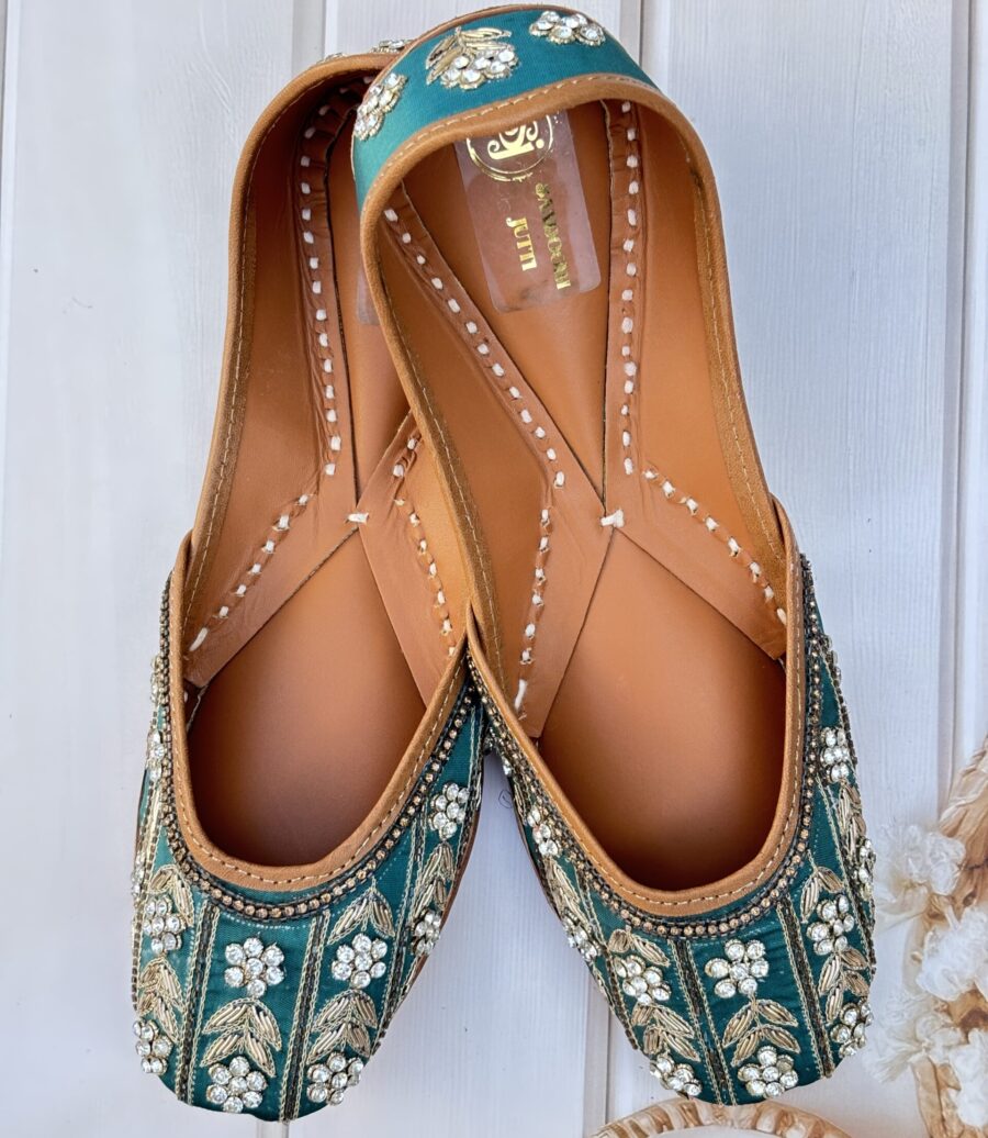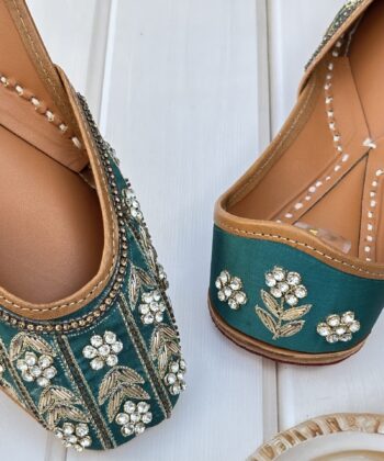 Elevate your footwear collection with our Teal Green Punjabi Juttis, a harmonious blend of traditional craftsmanship and contemporary elegance. These handcrafted juttis feature a rich teal green base adorned with intricate golden dabka, antique cutdana, and zarkon work, creating a captivating design that exudes sophistication.