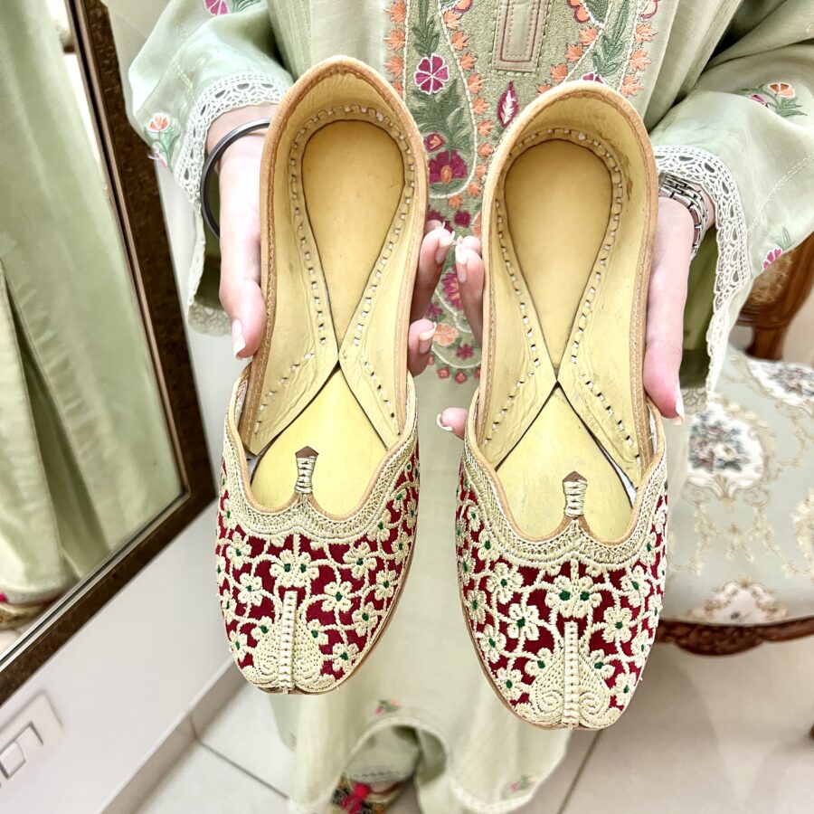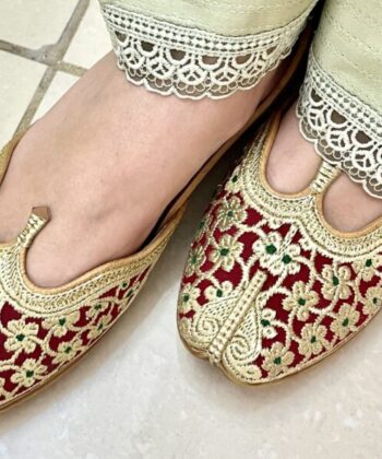 Step into elegance with our handcrafted Tilla Phulkari — a Red Velvet Punjabi jutti adorned with delicate golden tilla embroidery in enchanting pattern.