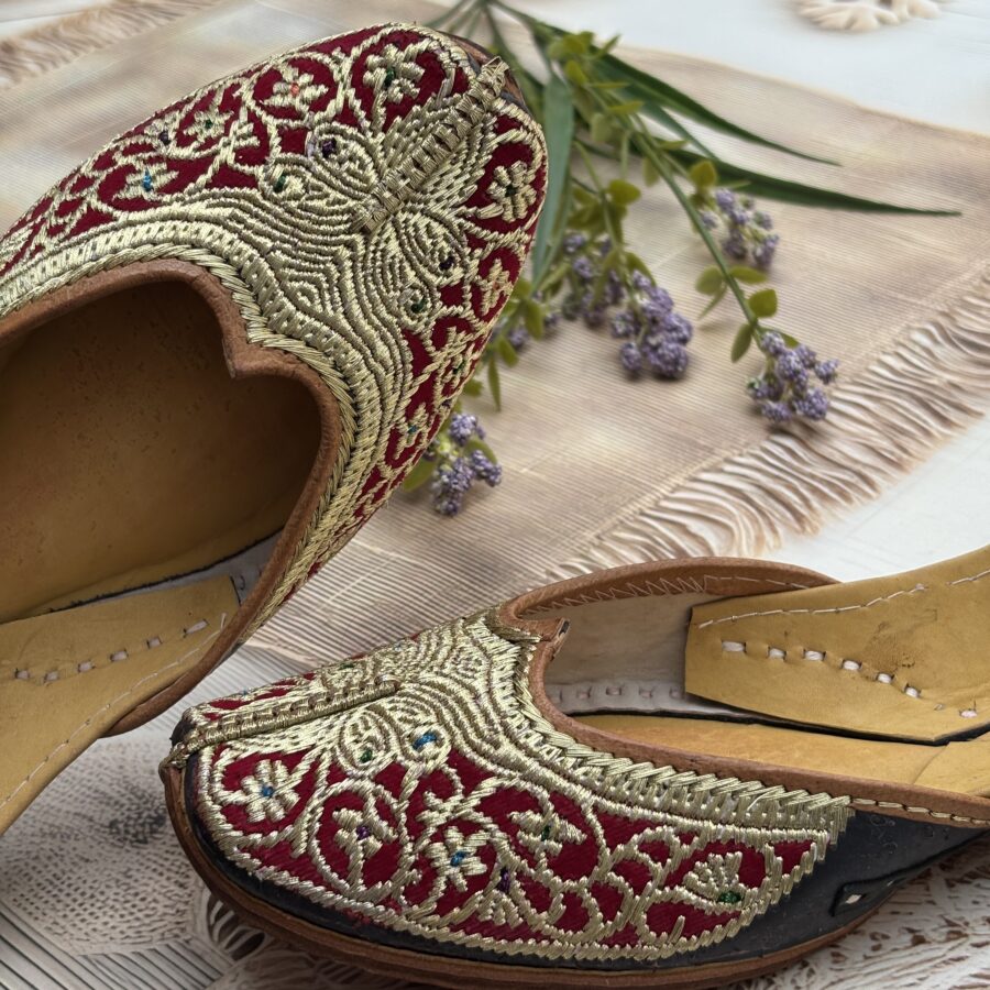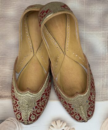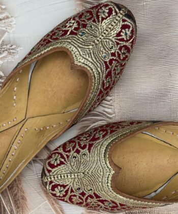 Step into elegance with our handcrafted Tilla Phulkari — a Red Velvet Punjabi jutti adorned with delicate golden tilla embroidery in enchanting pattern.