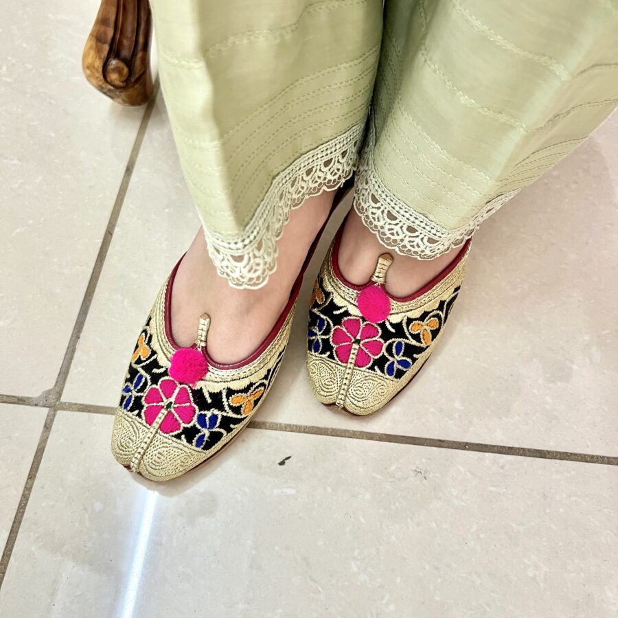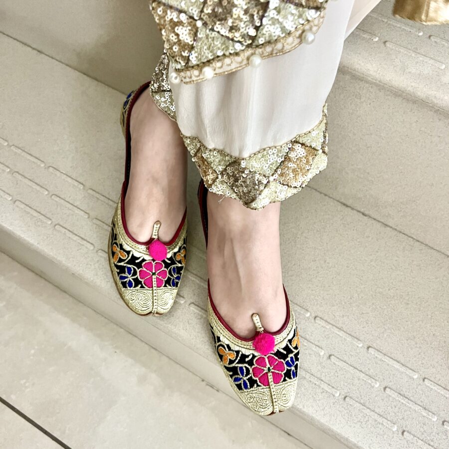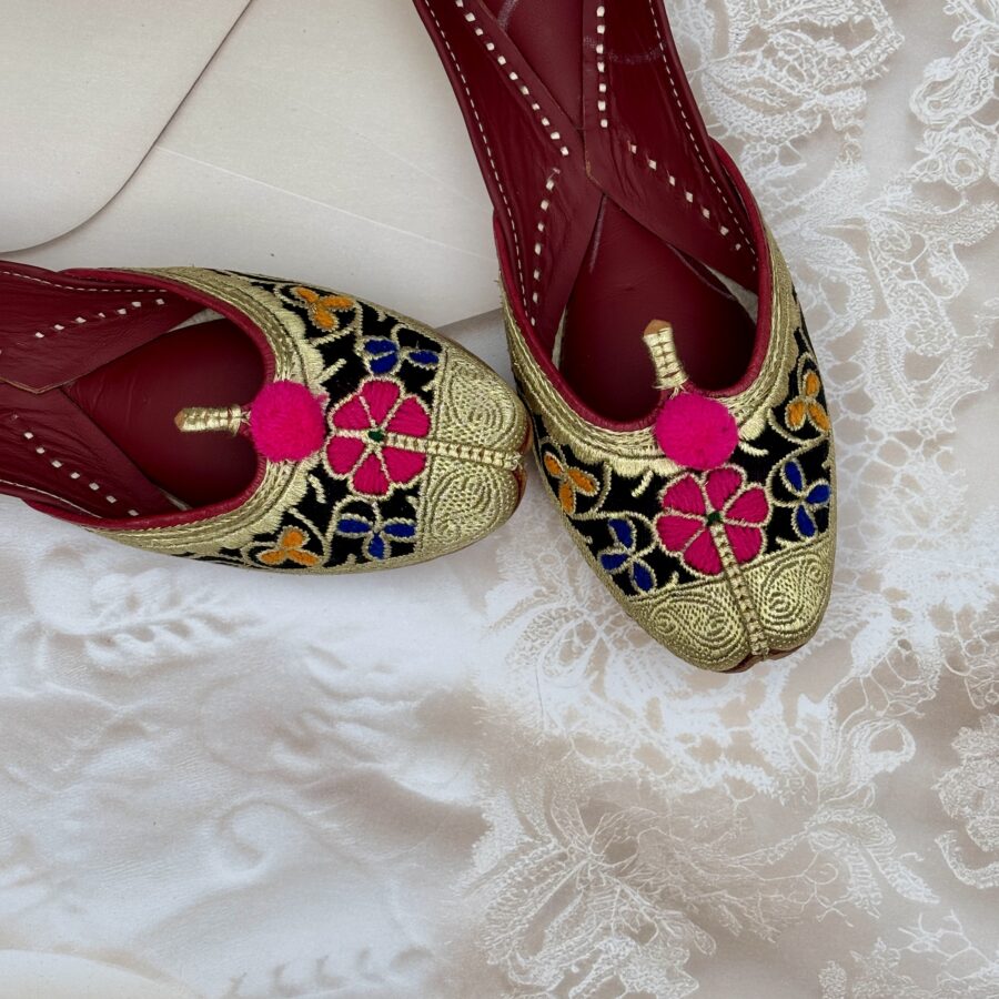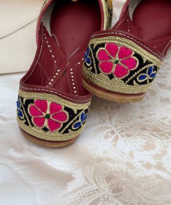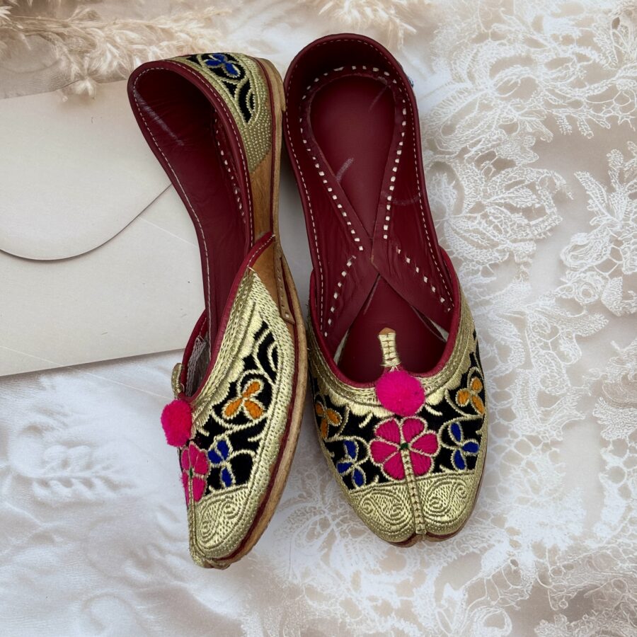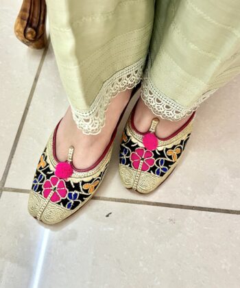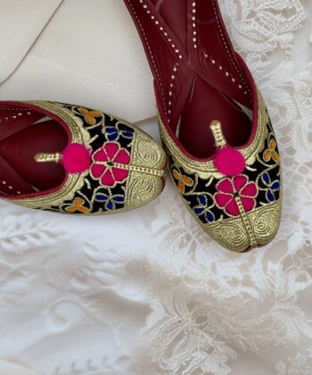 Step into elegance with our handcrafted Tilla Phulkari — a Black Velvet Punjabi jutti adorned with delicate golden tilla embroidery and pink floral pattern.