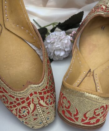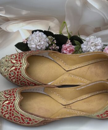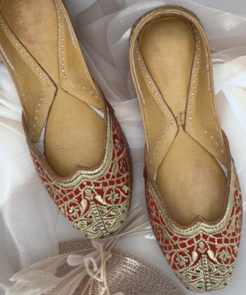 Step into elegance with our handcrafted Tilla Phulkari — a Red Velvet Punjabi jutti adorned with delicate golden tilla embroidery in enchanting pattern.