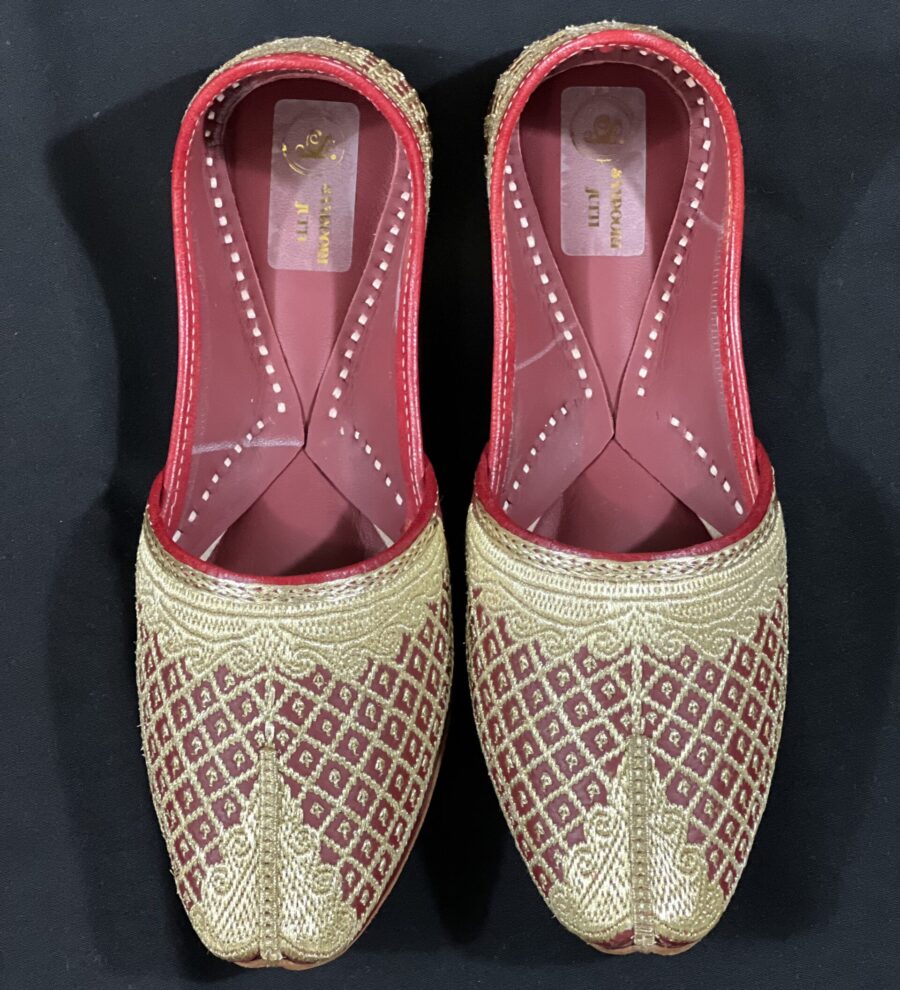 Step into tradition with our Men’s Tilledaar Jutti in rich red polished leather, featuring intricate golden tilla embroidery in a striking diamond pattern. This handcrafted masterpiece is a celebration of timeless artistry, designed for men who appreciate cultural roots with a modern edge.