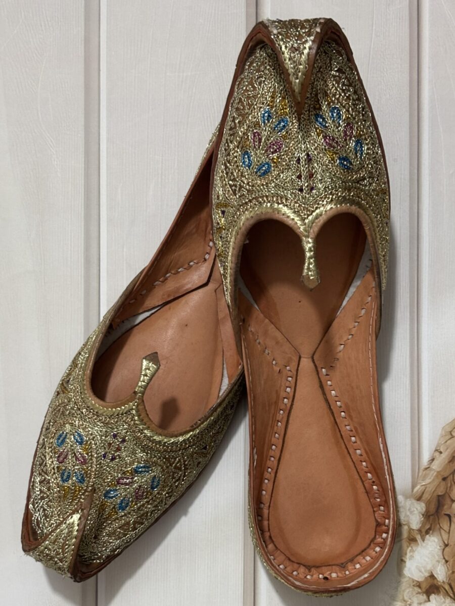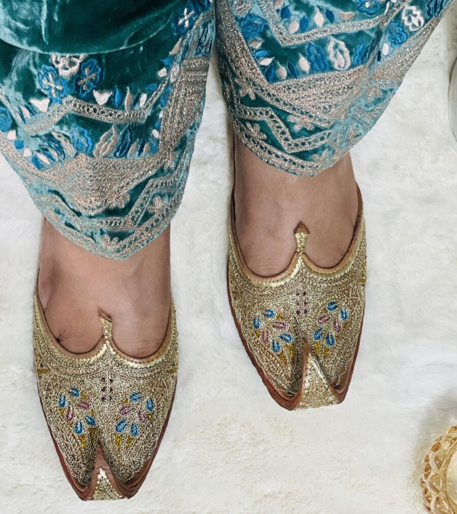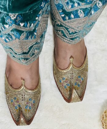 What makes it extraordinary is the intricate Pakistani golden tilla and Aari handwork by Afghan artisans, woven with heritage in every stitch. The rich texture and subtle sheen of this jutti make it the perfect match for bridal lehengas, shararas, or traditional suits.